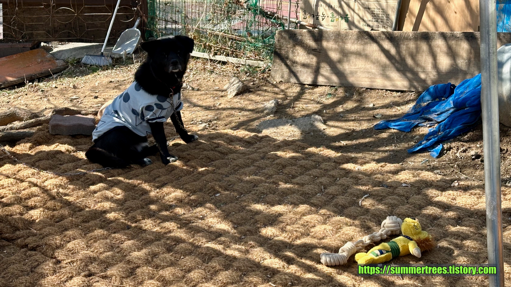 자전거가게에서 키우는 지 바깥에서 길러지는 강아지. 외로운지 마야를 보고 반가워하는데 마야는 역시 반응이 없었다. 외롭지 말라고 던져 준 인형이 몇 개 있었다.