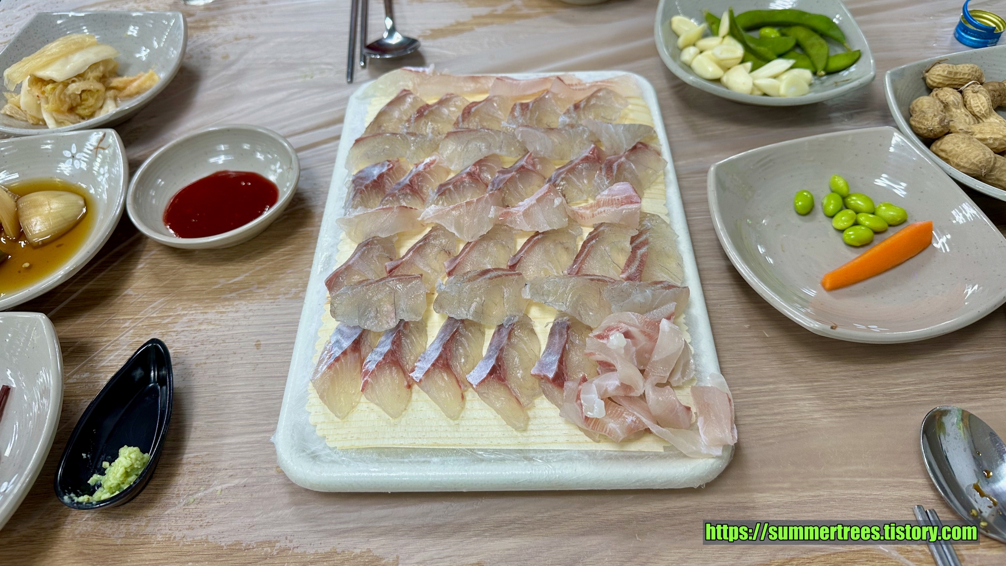 그리고 모듬회를 벗어나 감성돔을 시켰다. 보통 모듬회를 시키면 '소'짜여도 항상 다 먹지 못하고 남겼는데, 감성돔을 시키니 양이 딱 맞아서 남기지 않고 다 먹을 수 있었다. 다음에 모듬회를 주문해봐야 다른 집과 양을 비교할 수 있을 듯 하다.