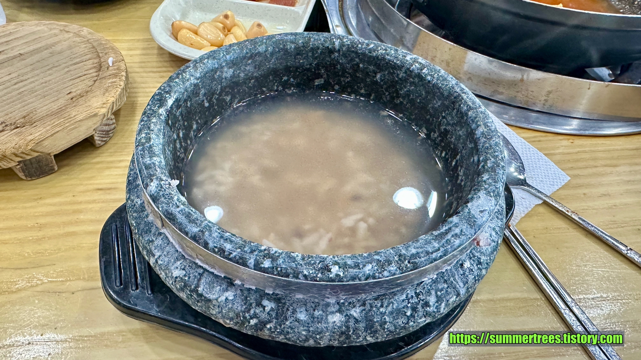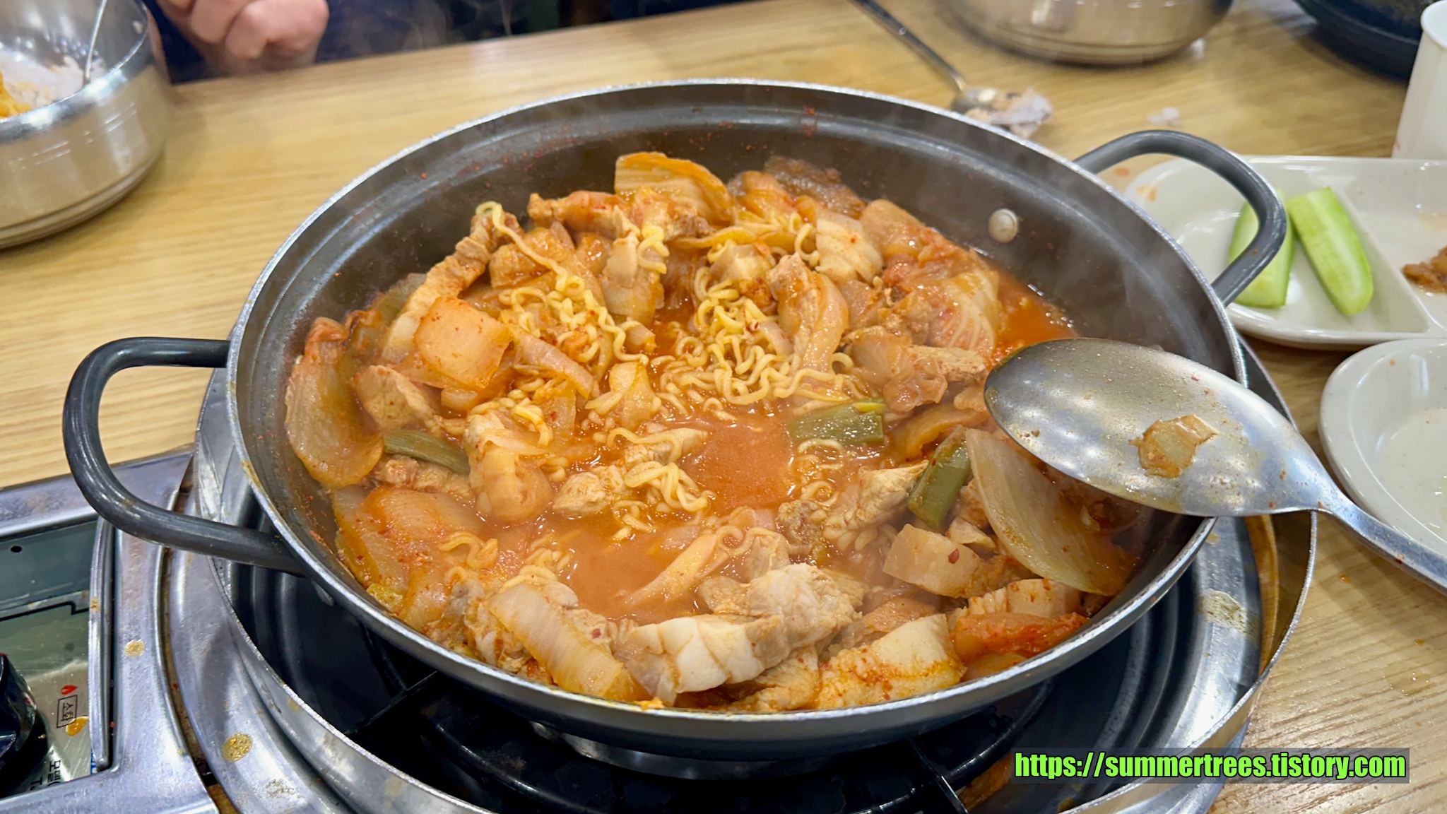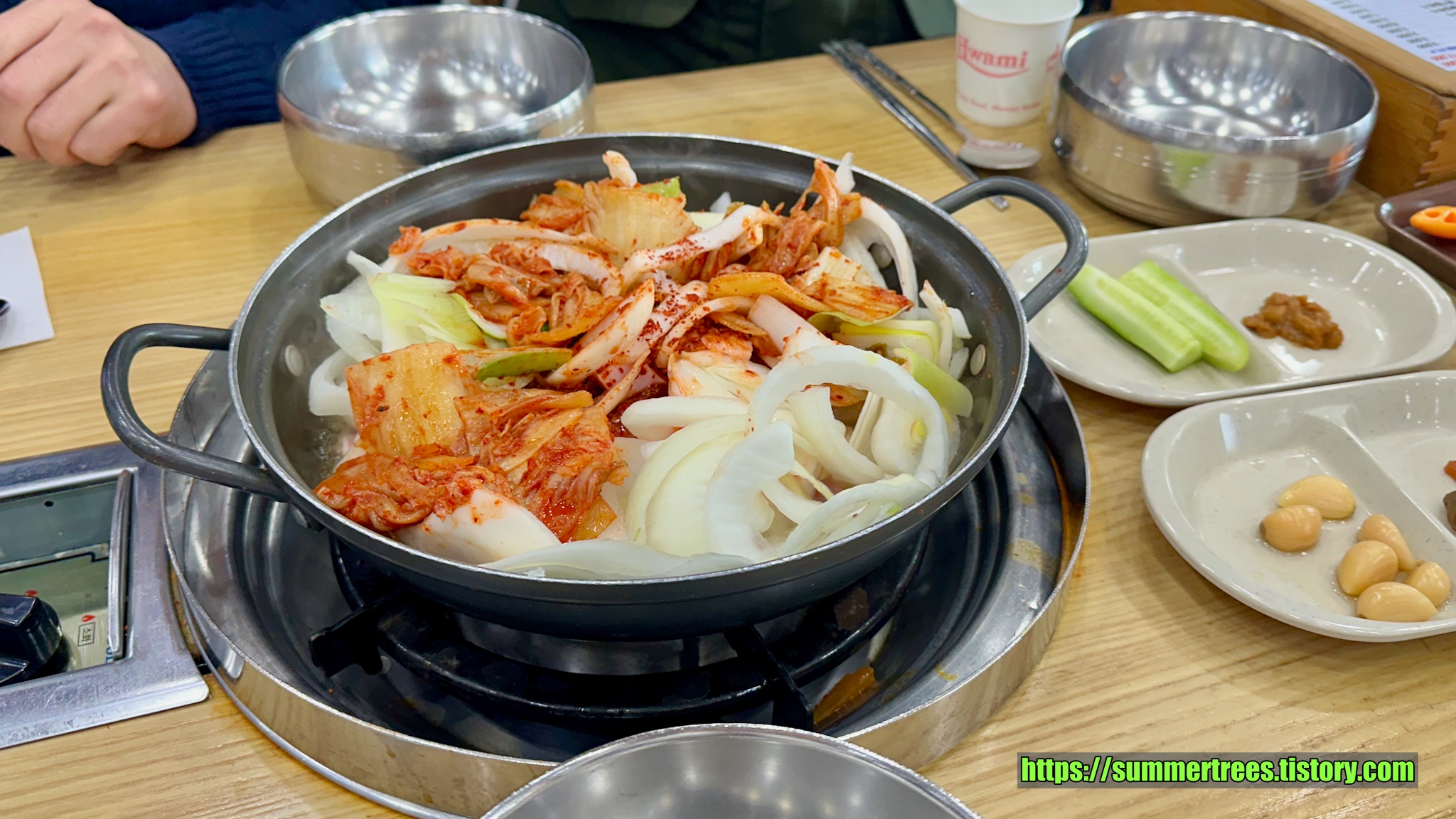 특이하게 사람 수에 맞게 종지에 담긴 김치를 주고, 그걸 찌개에 부어 끓여먹는 시스템이다.