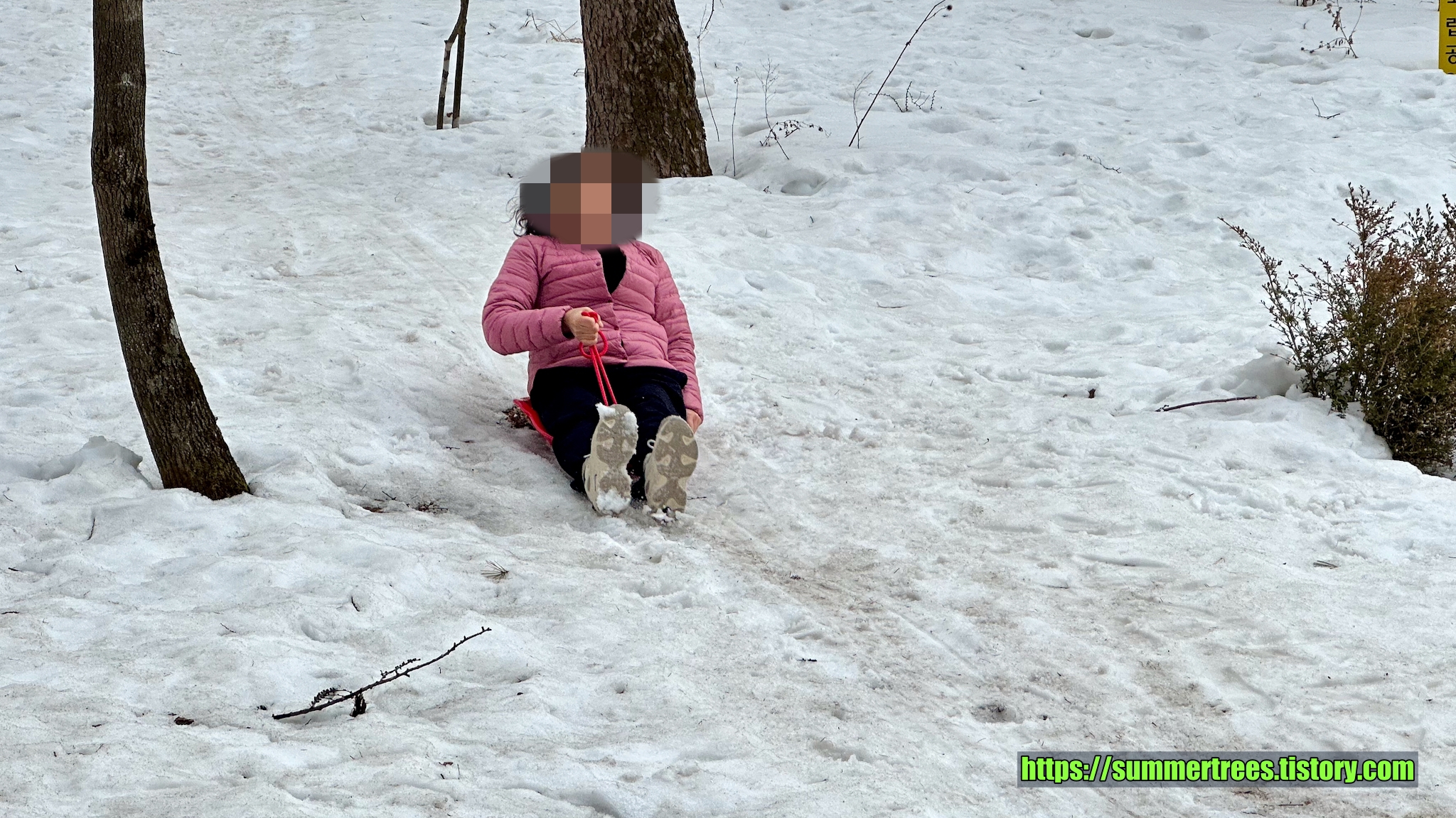 눈과 언덕이 있으니 썰매를 안탈수가 없다. 우리가 타는 것을 본 애기가 타고 싶어해서 잠시 빌려줬다.