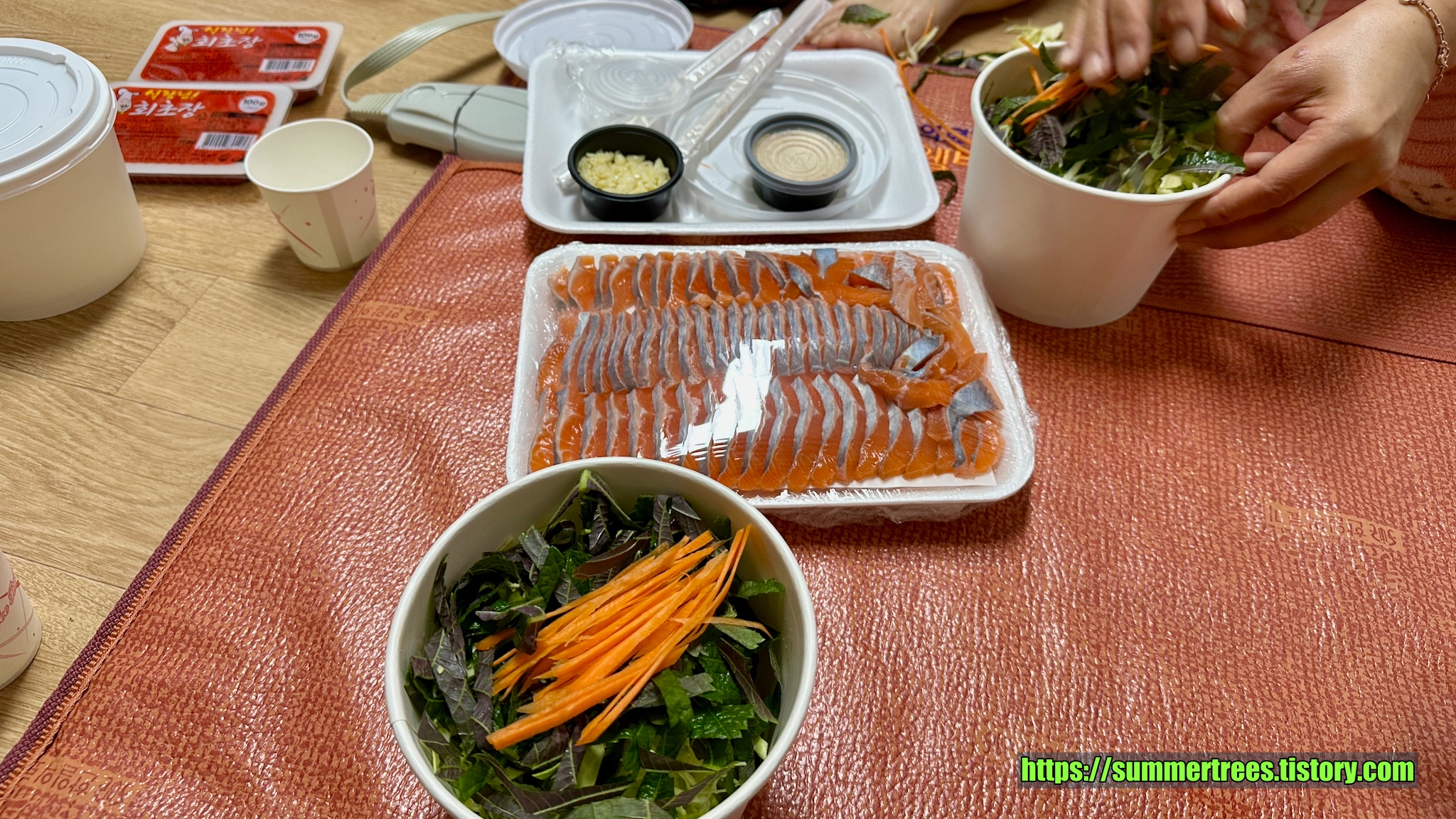 우리는 포장을 하고 숙소에서 먹었는데, 야채에 마늘과 콩가루, 송어회를 넣고 초장으로 비벼먹으니 맛있었다.