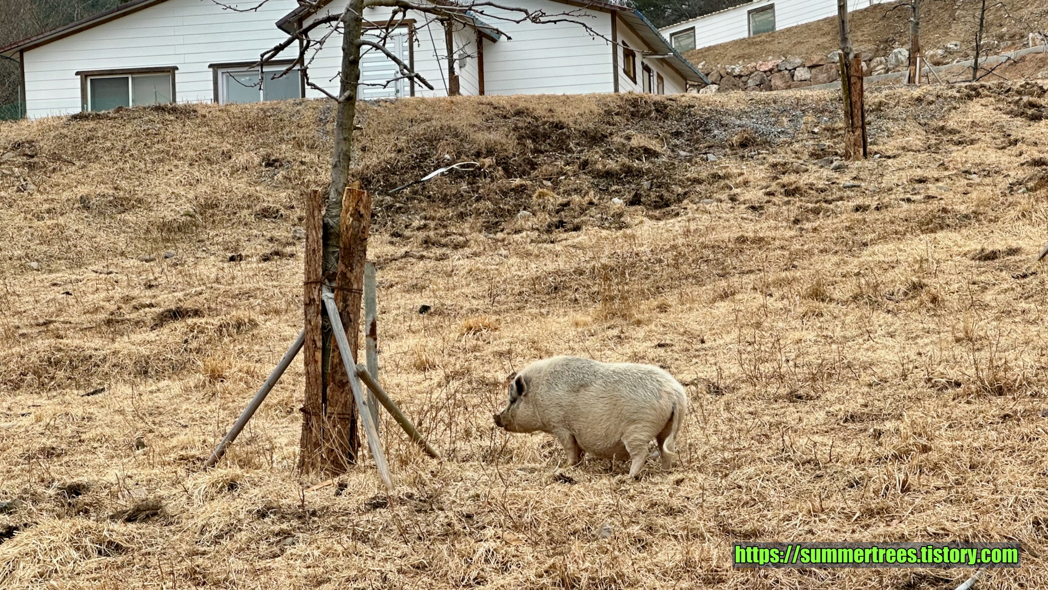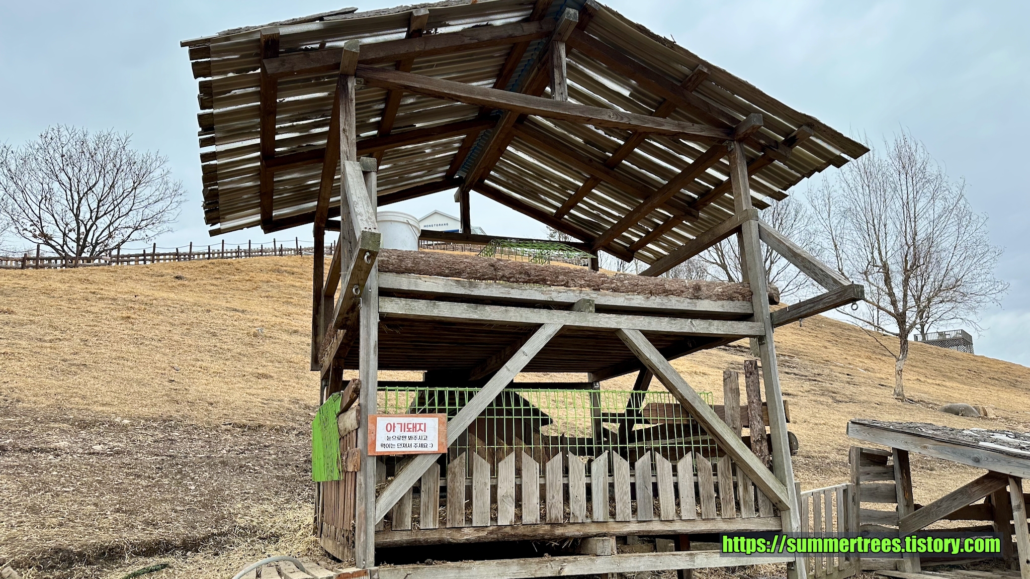 목장 입구에 아기돼지 팻말이 있는데 돼지는 보이지 않았다.