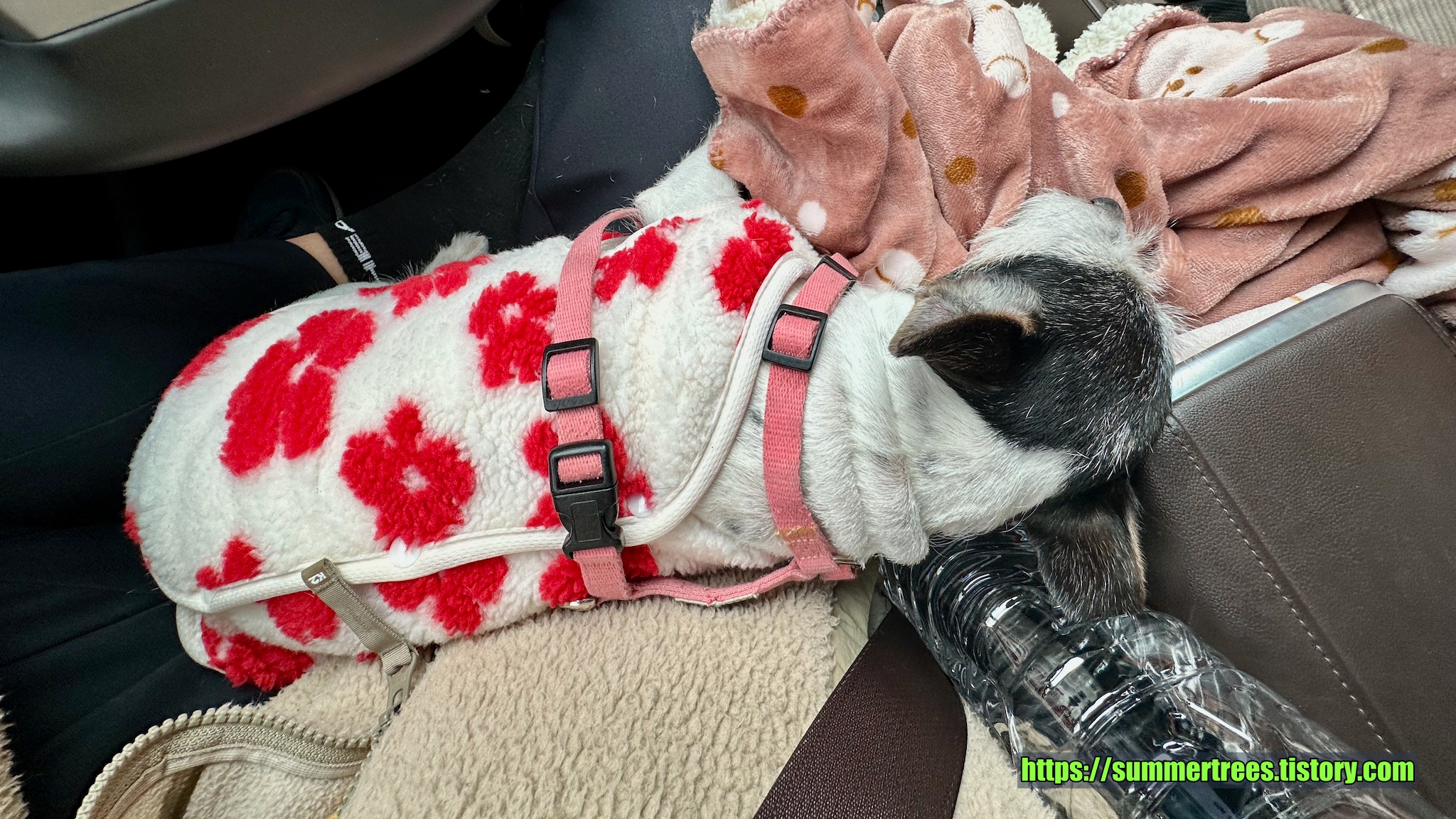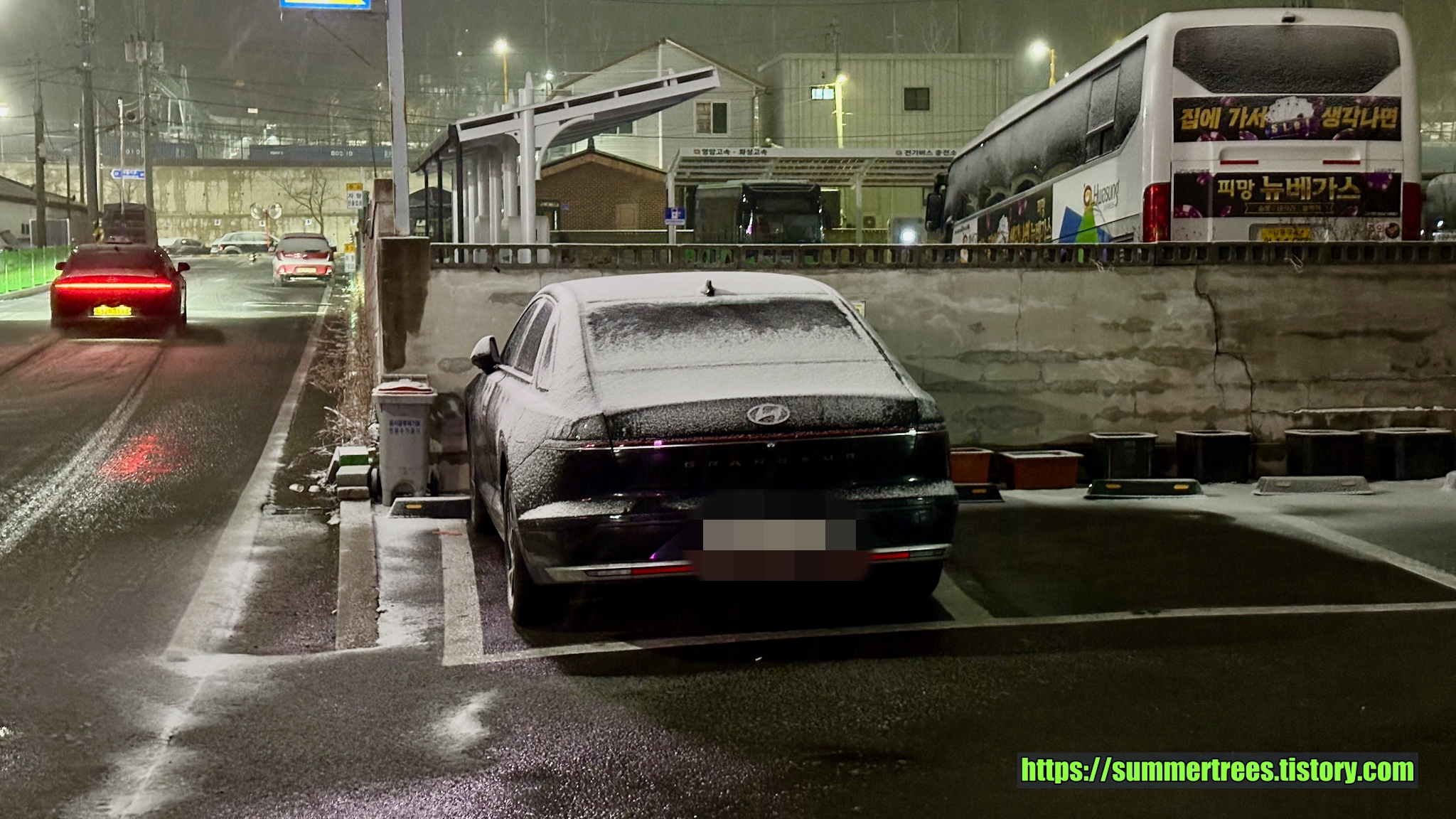 마야를 차에 두고 갔는데 차 위에 눈이 쌓였다.