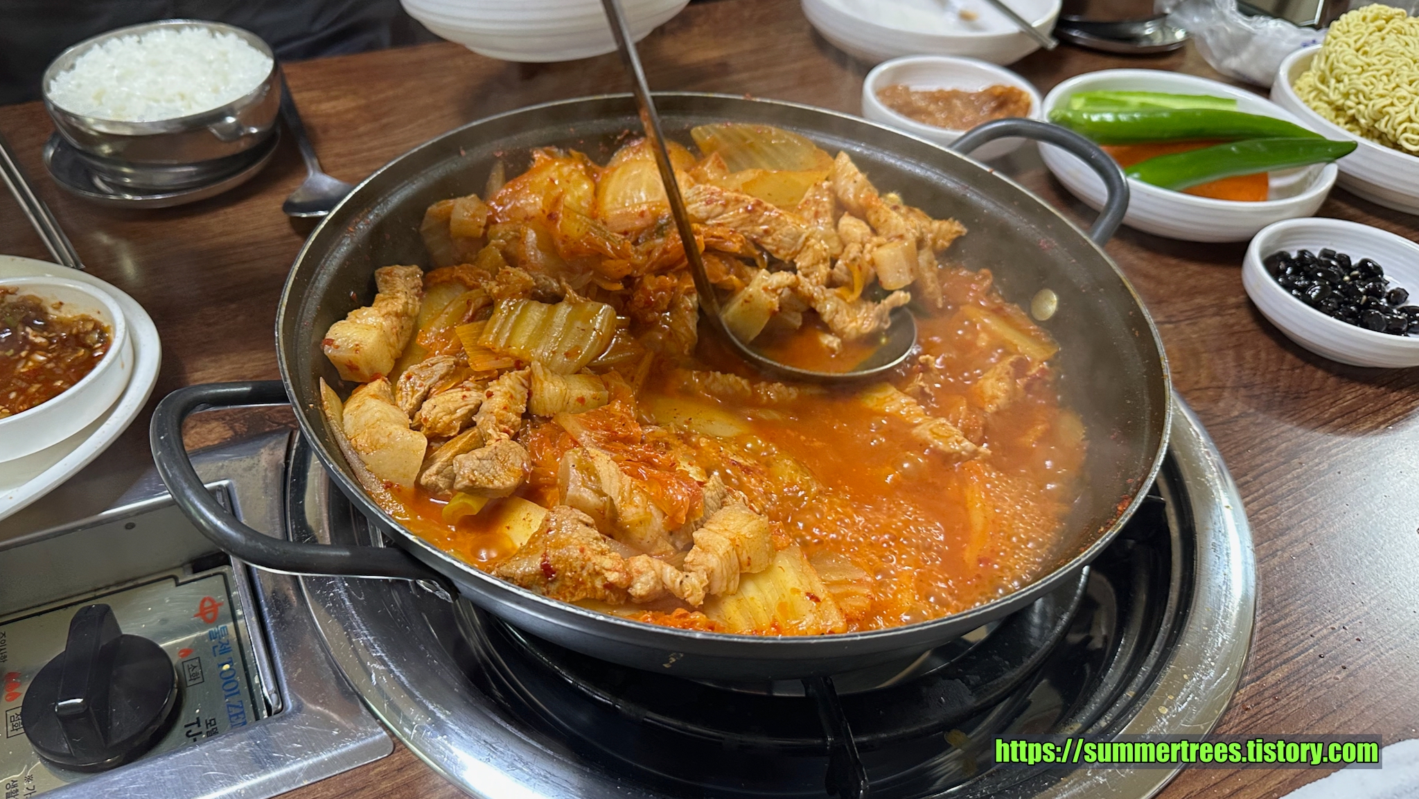 10년 전부터 다니던 곳을 가려했는데 착각해서 가게 된 곳.음식종류는 같았다.특이하게 사람 수에 맞게 종지에 담긴 김치를 주고, 그걸 찌개에 부어 끓여먹는 시스템이다.김치는 그리 넉넉한 양