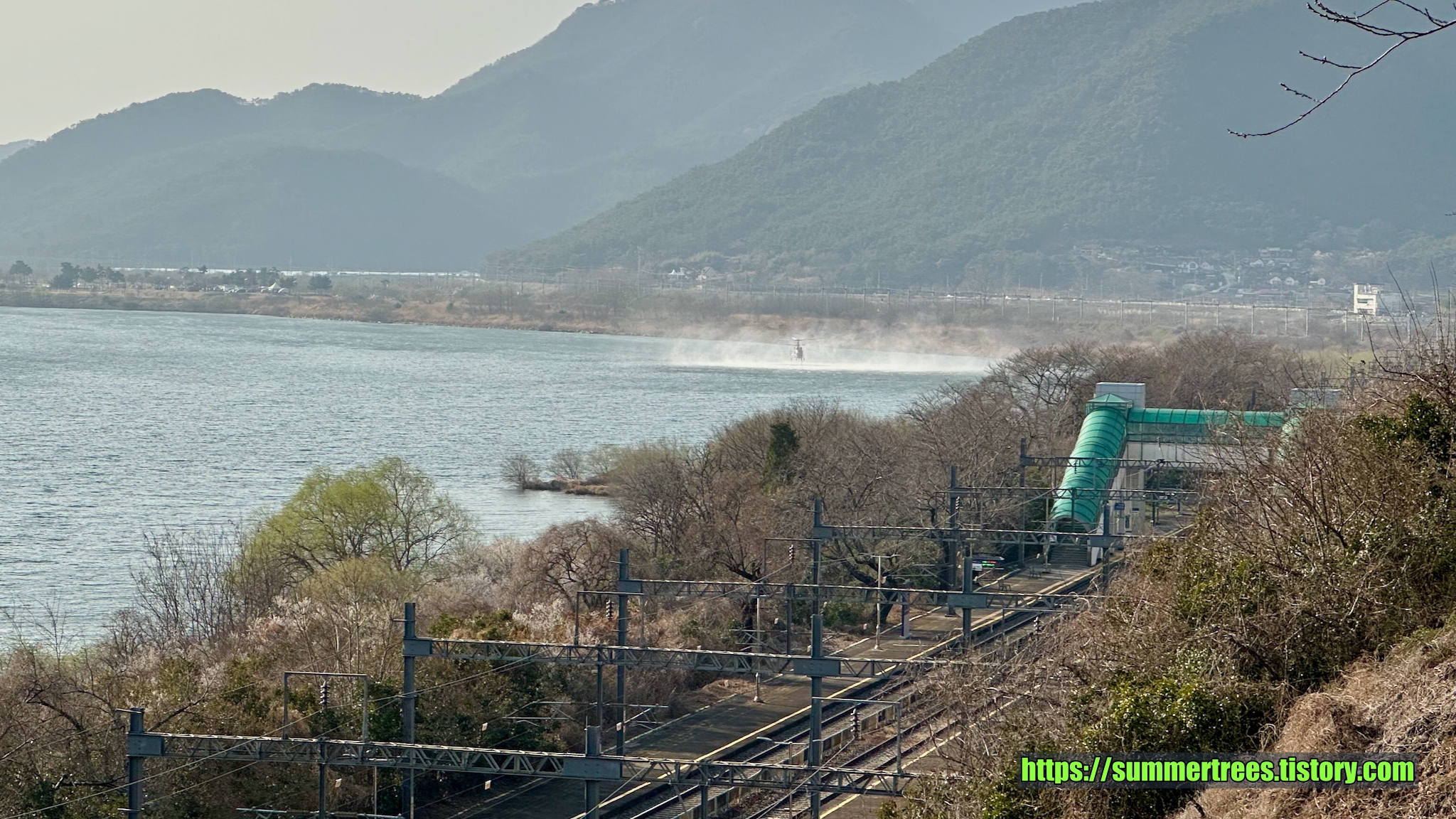 낙동강에서 헬리콥터가 물을 뜨는 것을 구경했다.