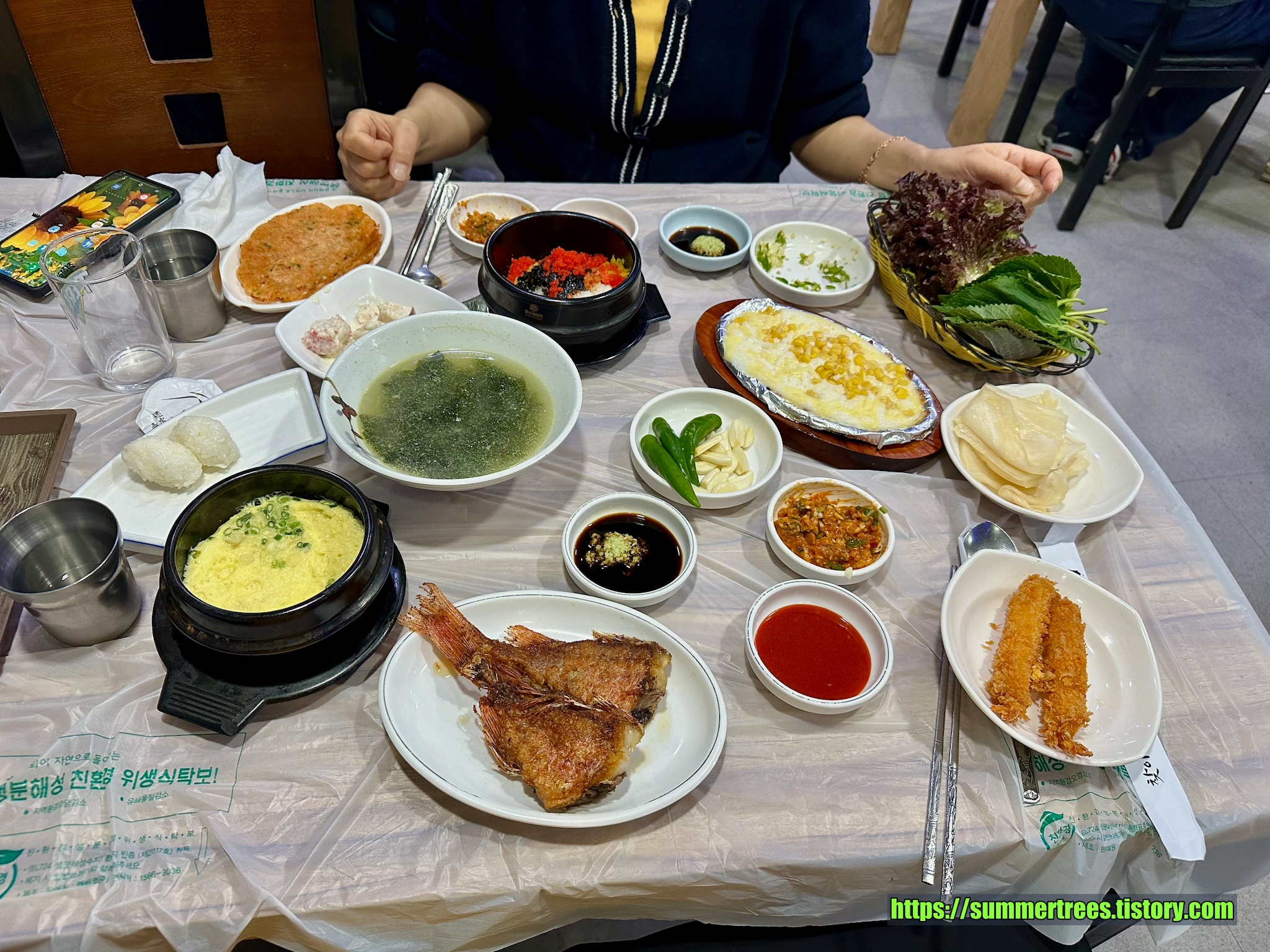 회의 양이 적은 대신 다양한 먹을거리가 나오는데 다 맛이 있다. 우리는 6만원짜리를 시켜서 안나왔는데 7만원 이상일 경우 물회도 나온다고 한다.