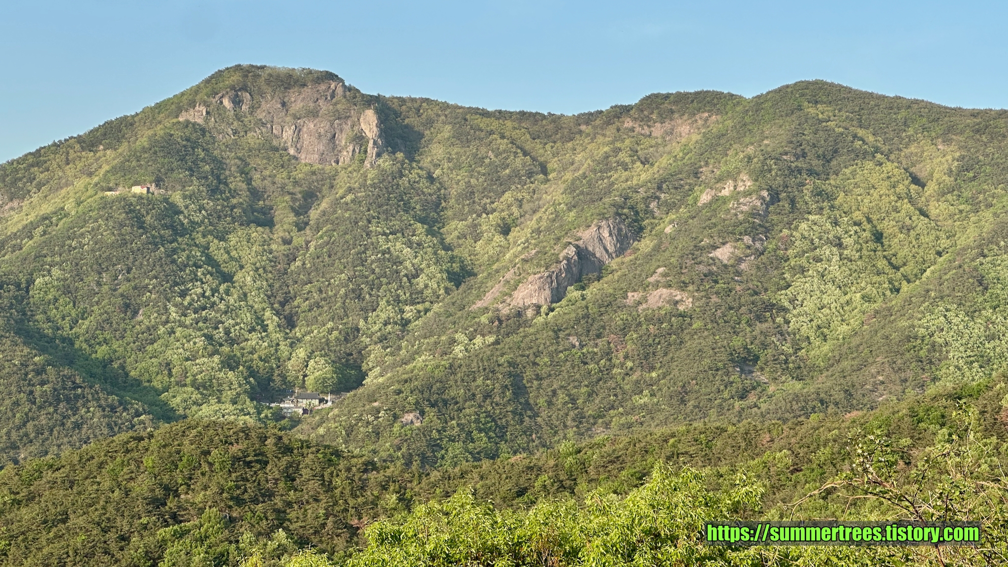 절이 천태산 골짜기에 감싸져 아늑한 느낌을 준다.