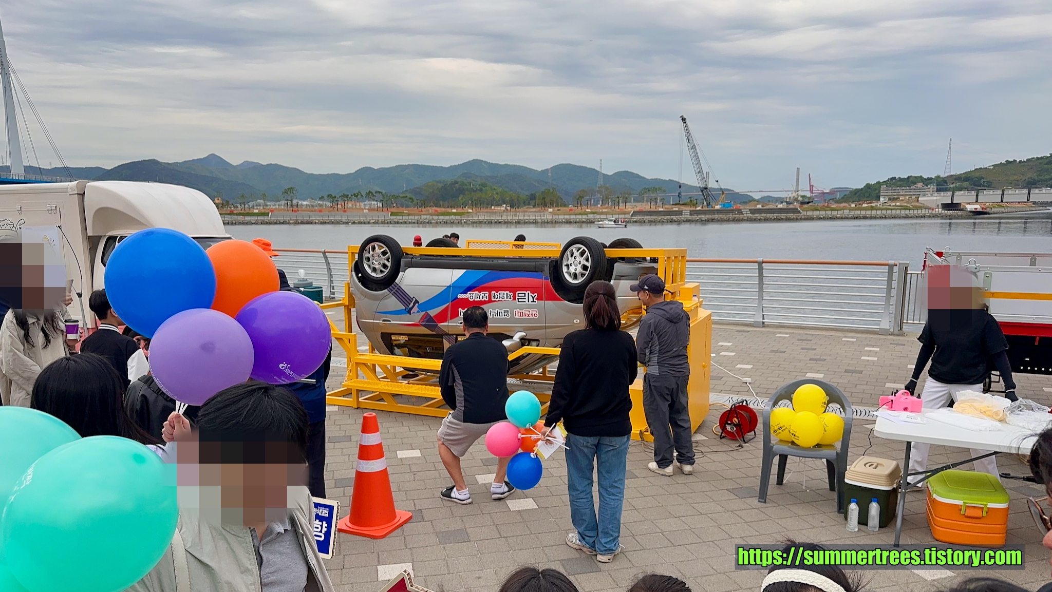 안전띠 체험. 차를 뒤집어준다. 재밌어 보이는 지 줄이 길다.