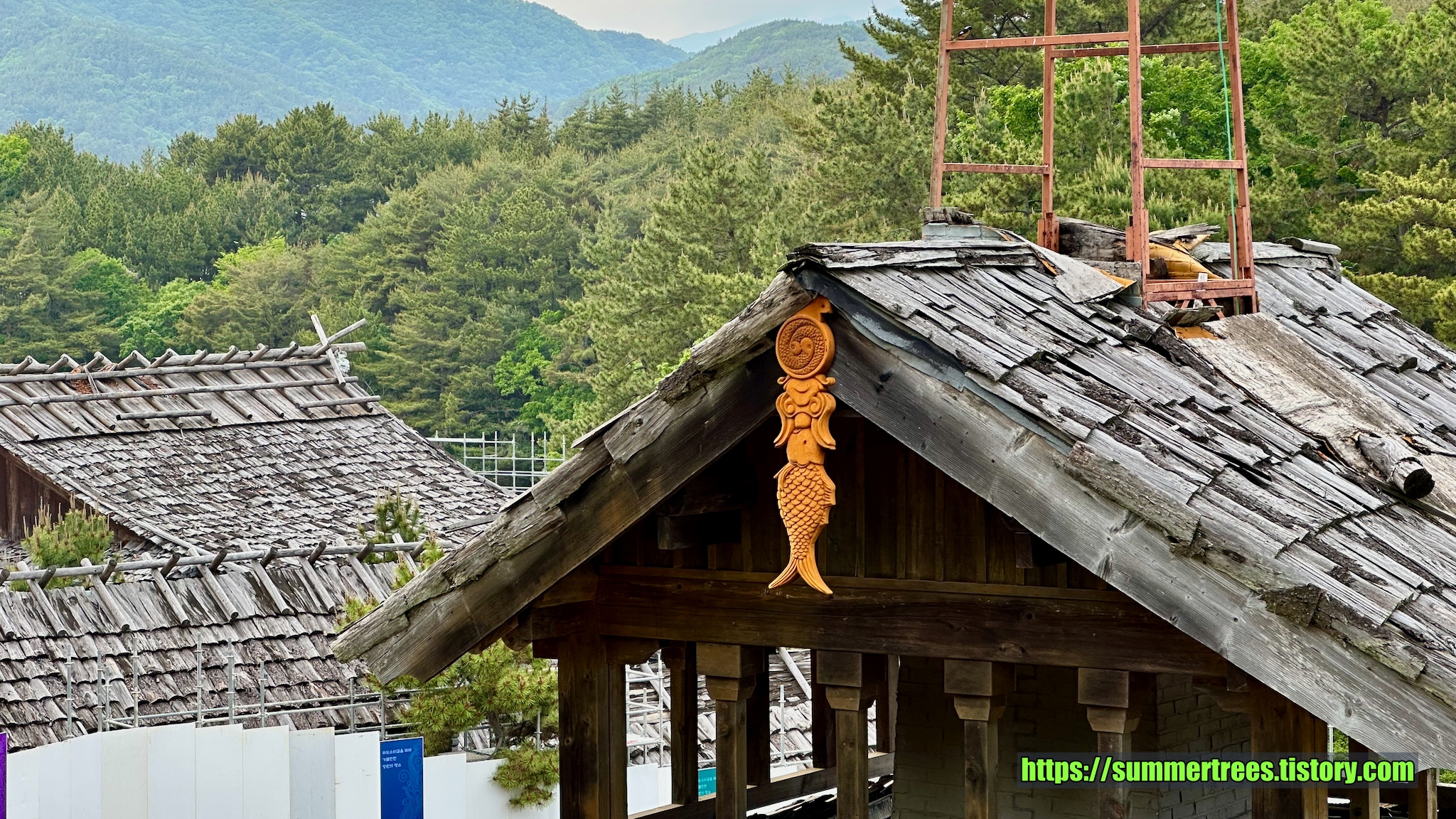 나무로 만든 기와를 얹은 독특한 형태의 건물들이 색다른 느낌을 준다.