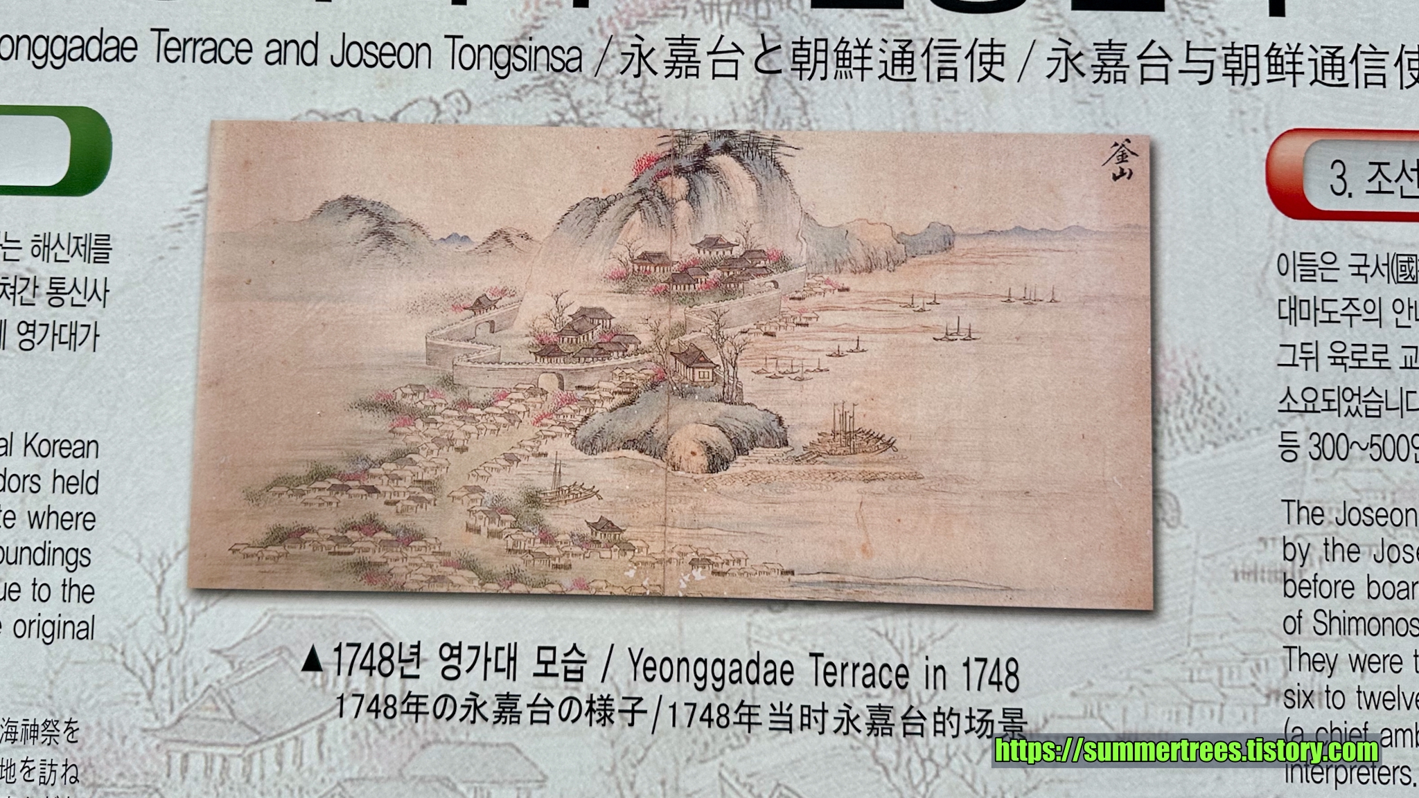 자성대와 별개로 영가대라고 하는 곳은 조선통신사들이 이용하던 시설이라고 한다. 특히 조선시대에는 영가대 앞이 바다였다는 것을 나타내는 그림이 있었는데, 이곳 일대가 바다였다는 것이 놀라웠다.