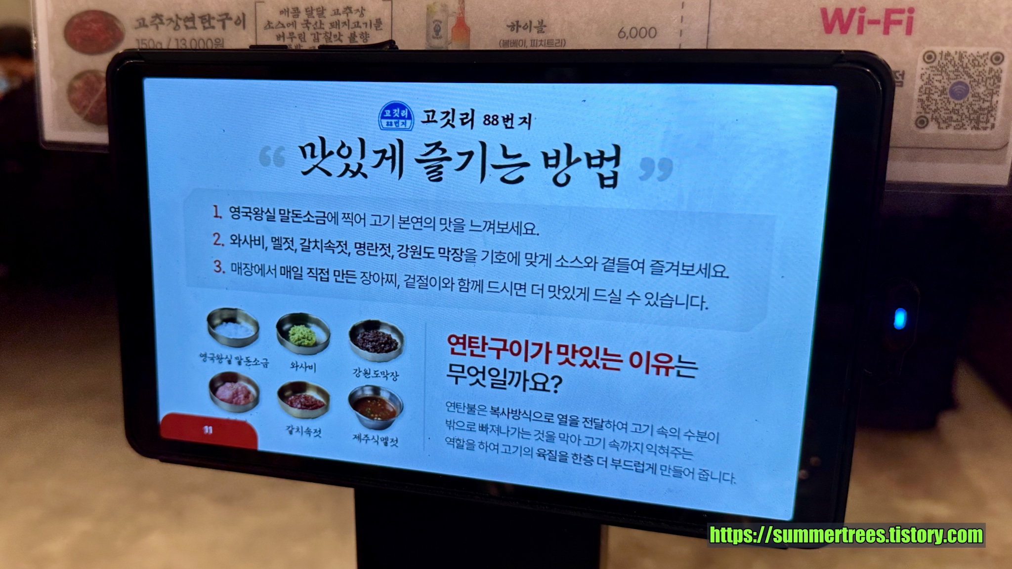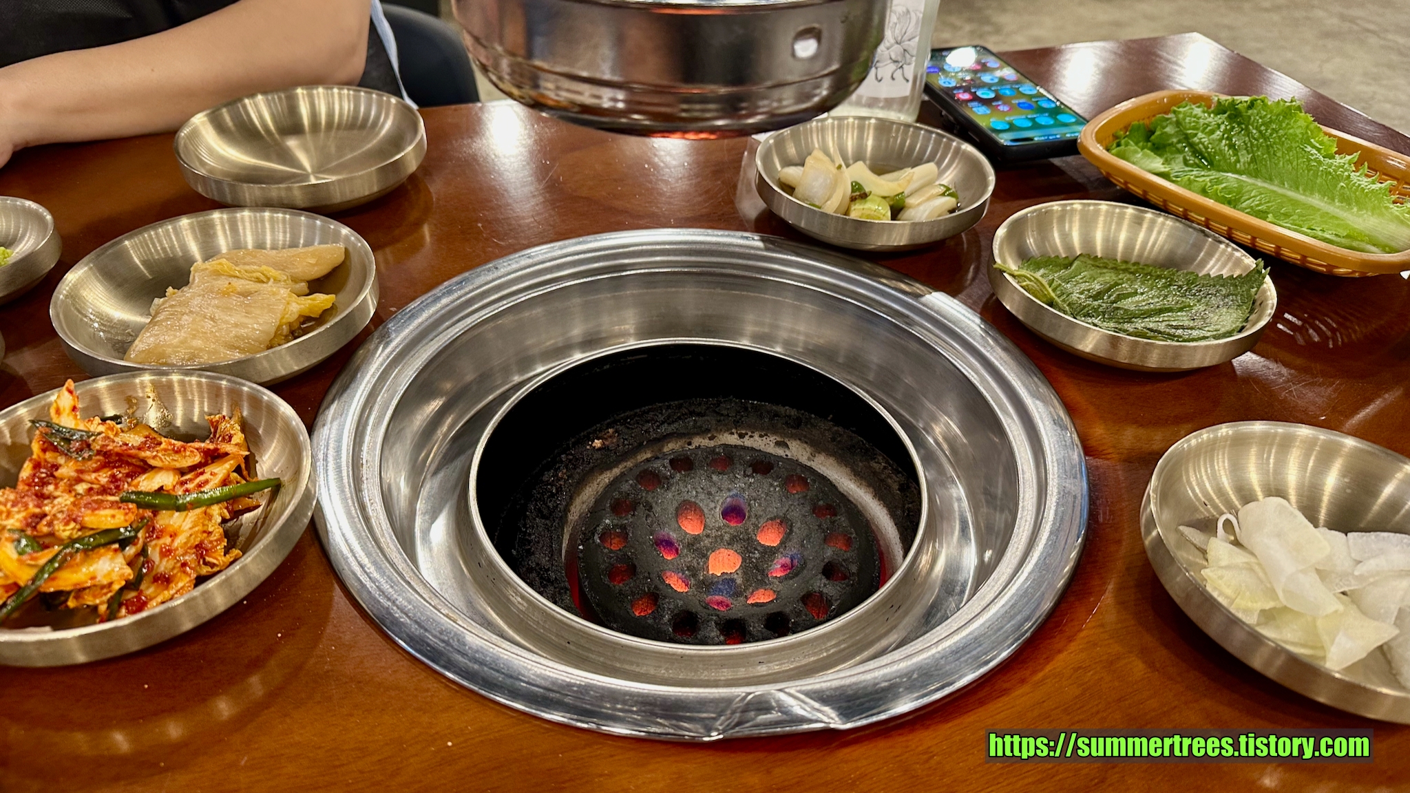 연탄불 고기. 숯이나 다른 것과 비교하니 연탄불은 오래 타서 그런지 고기가 익고 난 뒤 말라가는 느낌이었다.