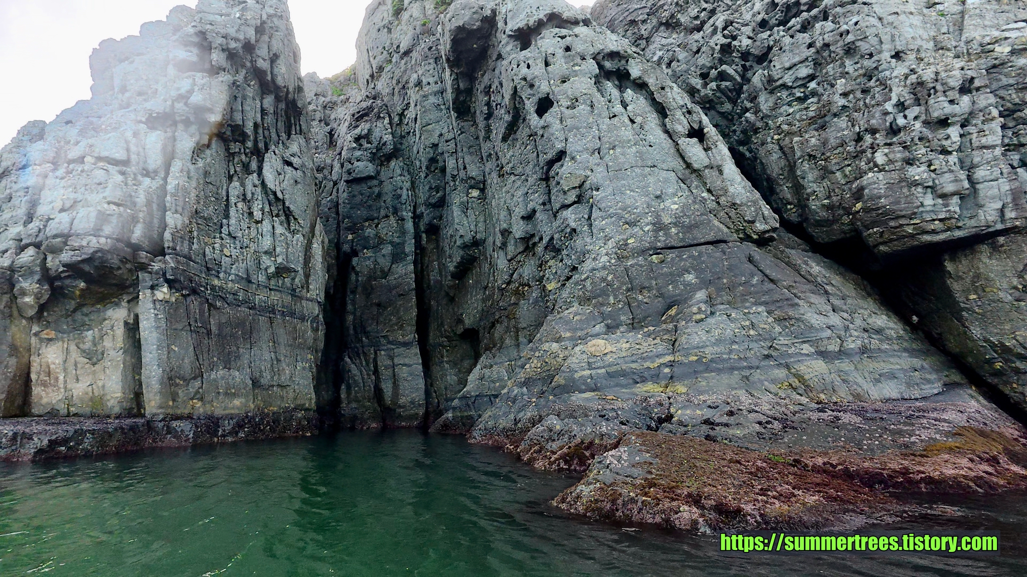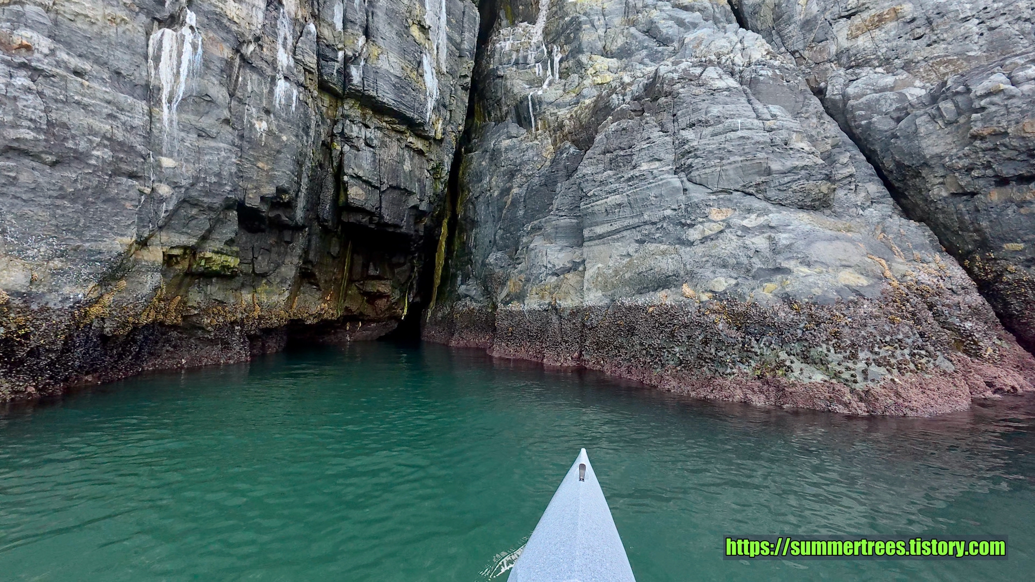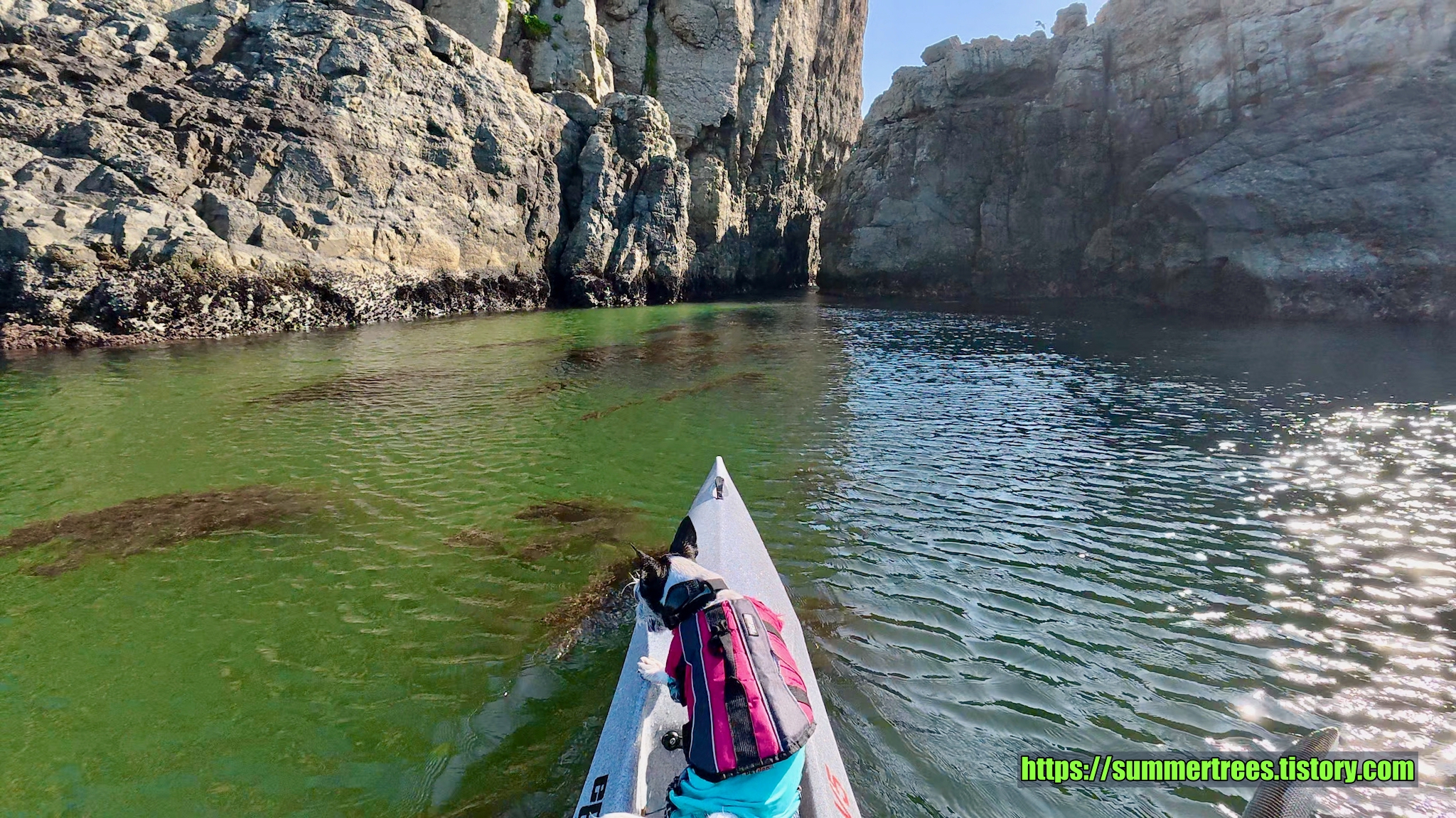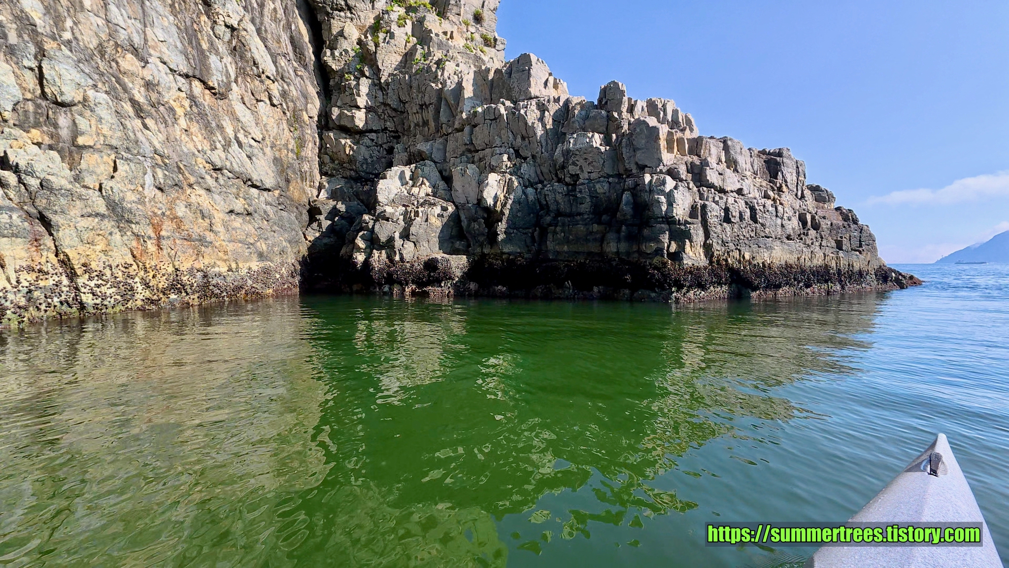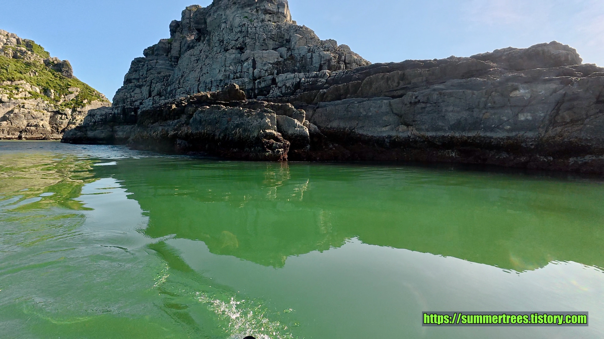 굴섬을 돌아가면 움푹 들어간 골이 보이고 그 안쪽으로 굴이 보인다. 굴까지는 무서워서 못들어감.