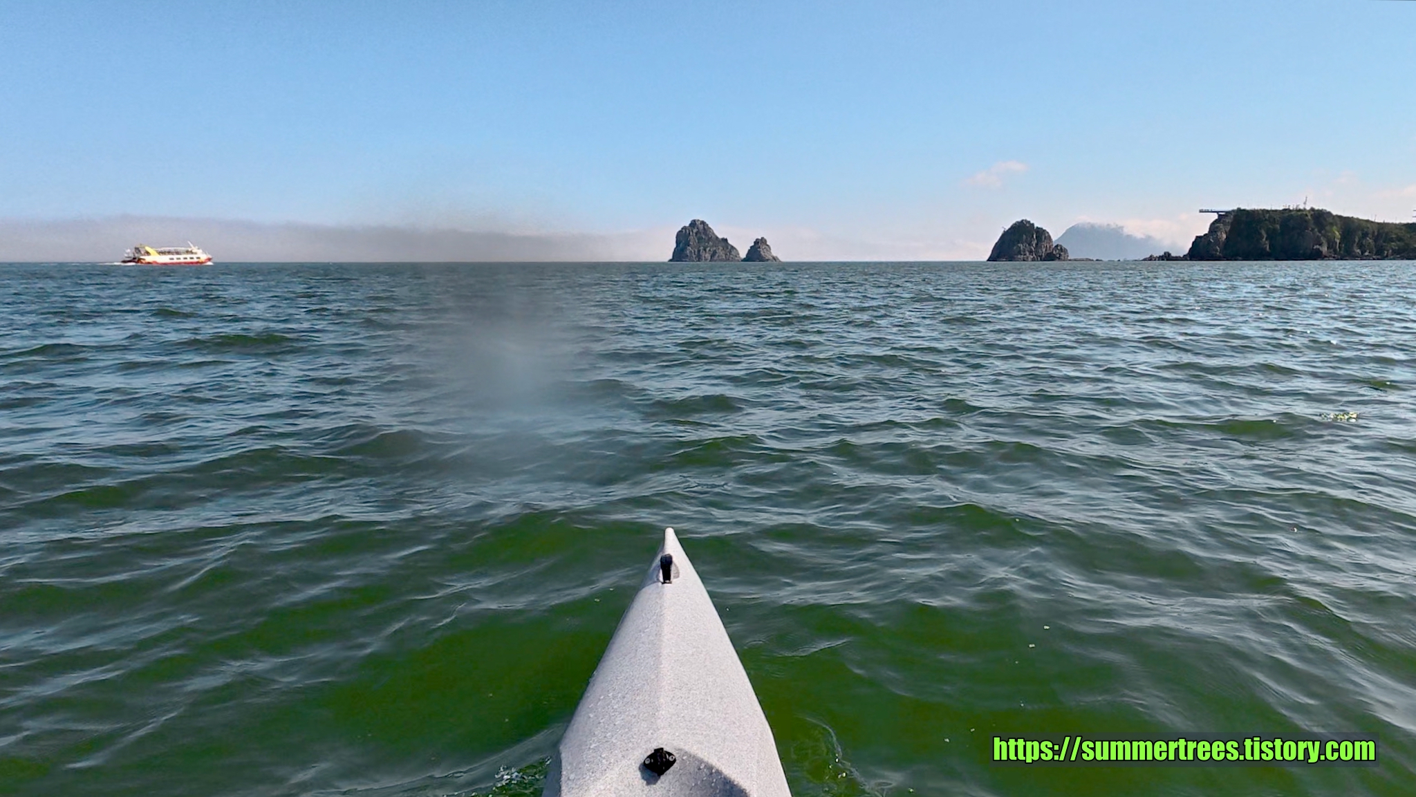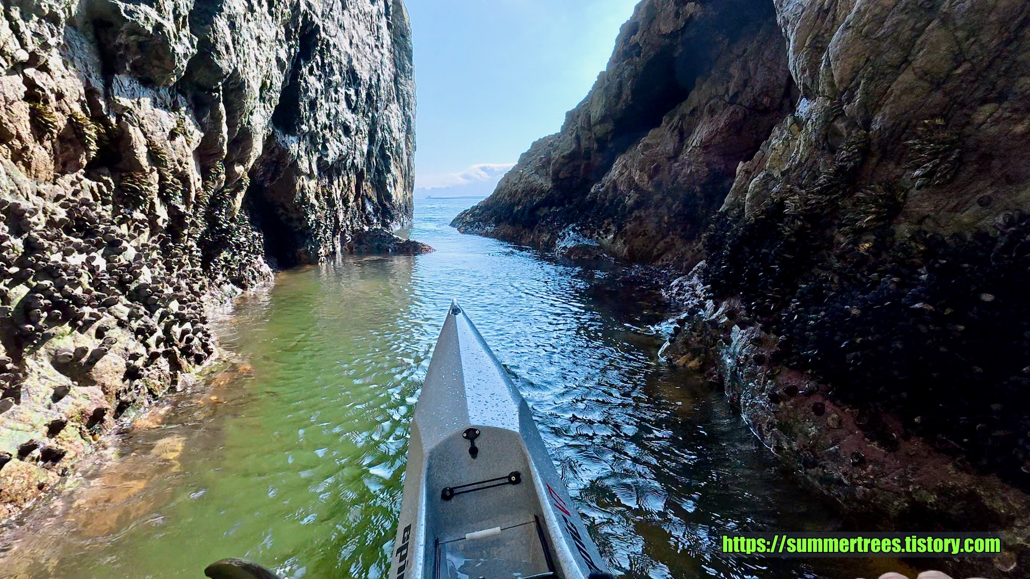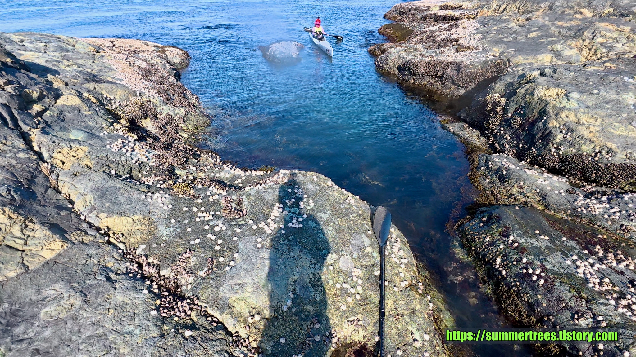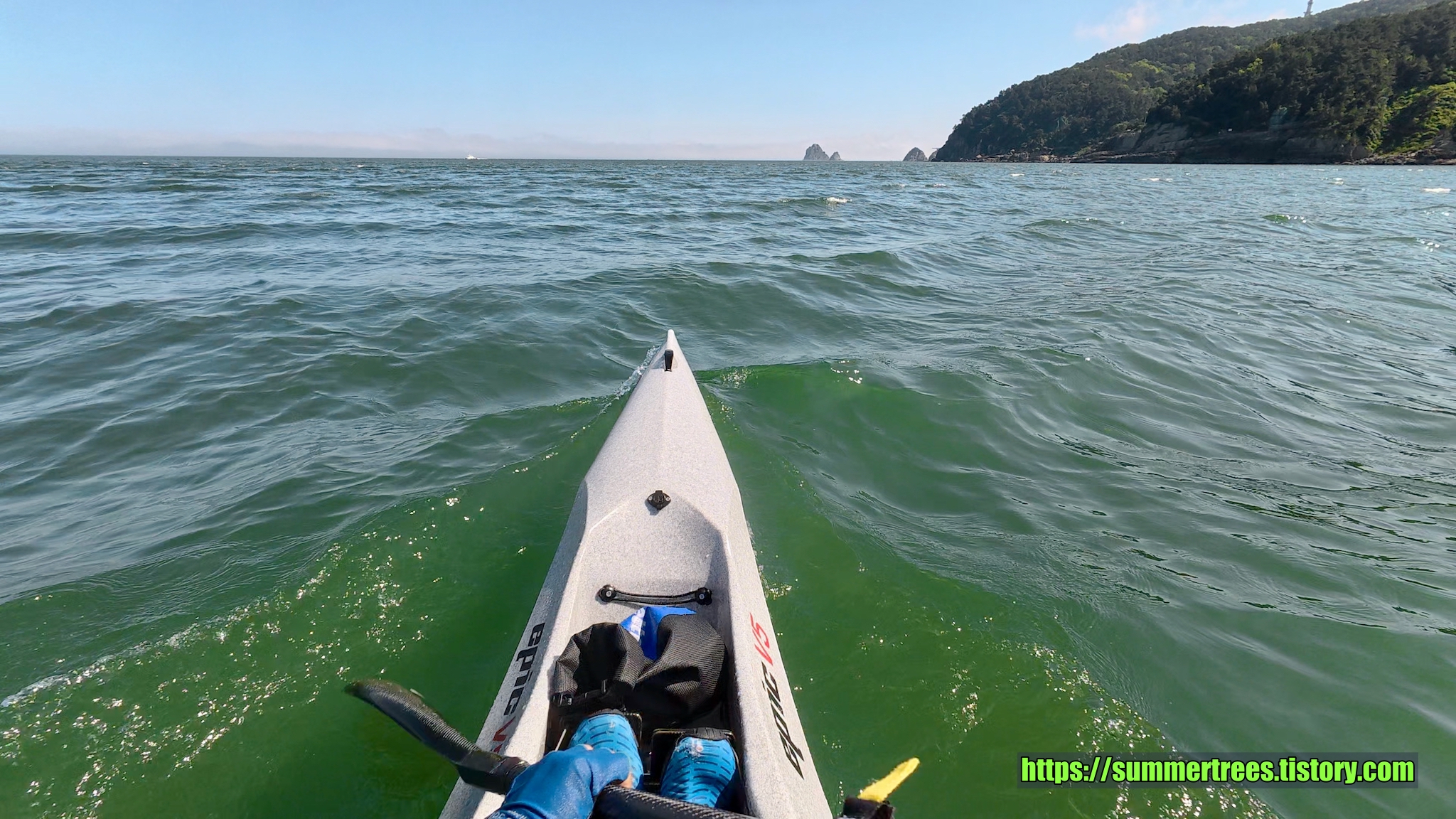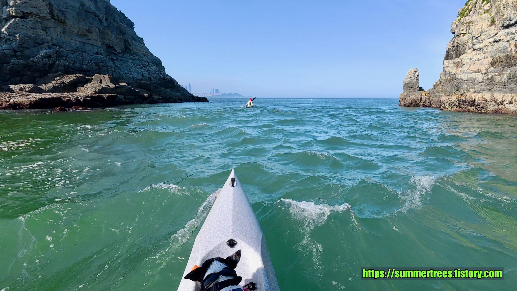 송곳섬과 수리섬 사이에 빠른 조류대가 있다. 초보 시절엔 바짝 겁먹었던 조류다. 이제 신나게 탄다.