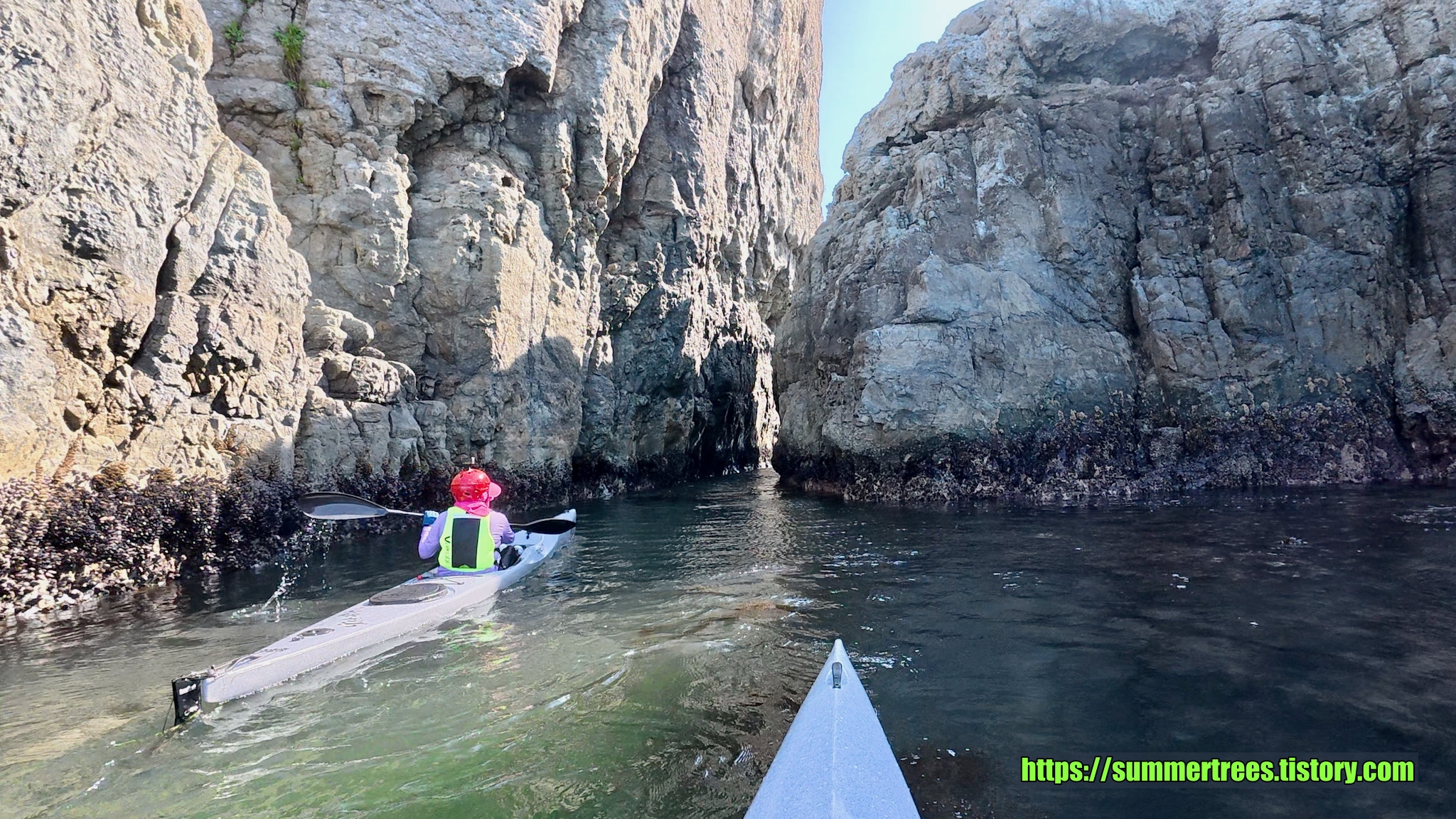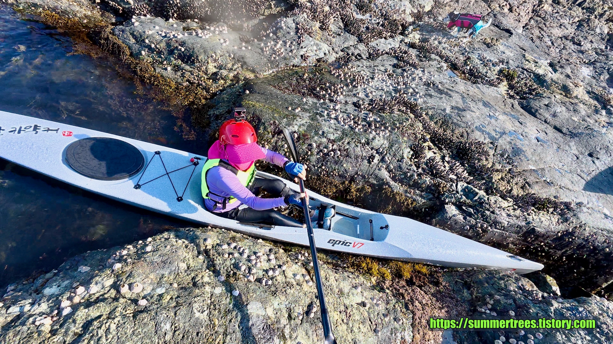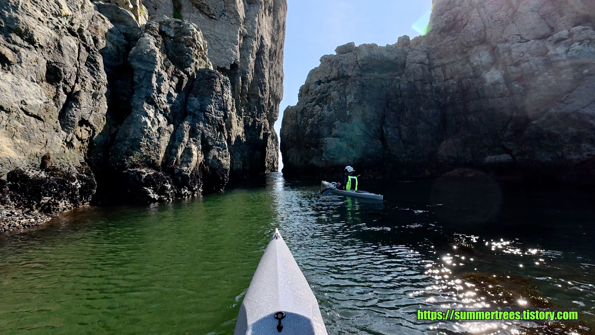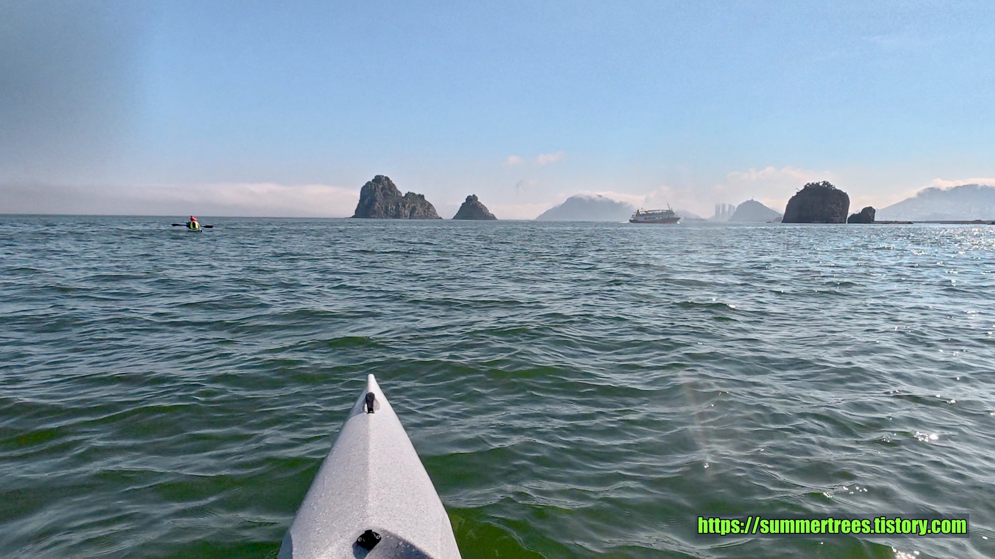 송곳섬과 수리섬 사이에 빠른 조류대가 있다. 초보 시절엔 바짝 겁먹었던 조류다. 이제 신나게 탄다.
