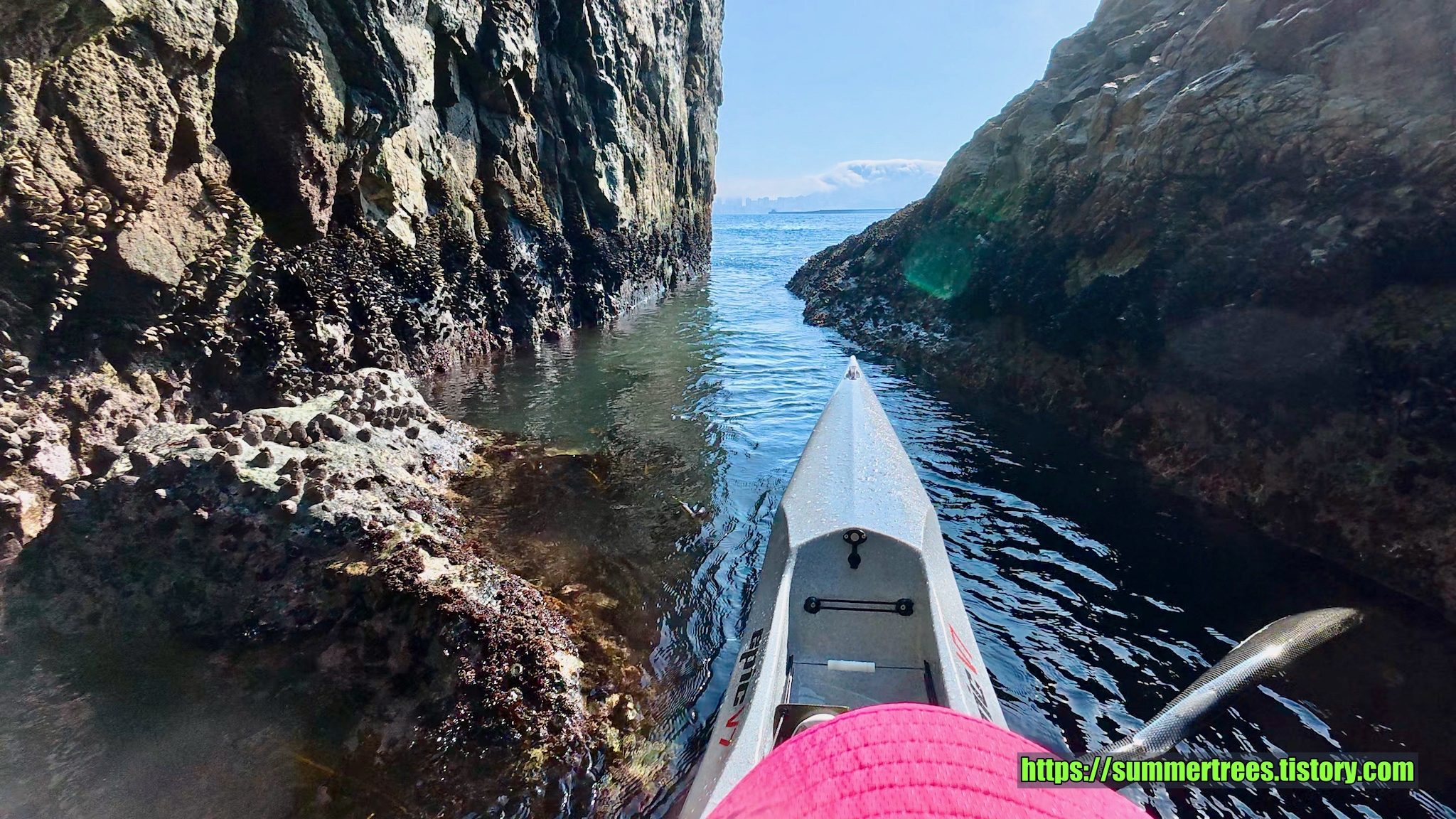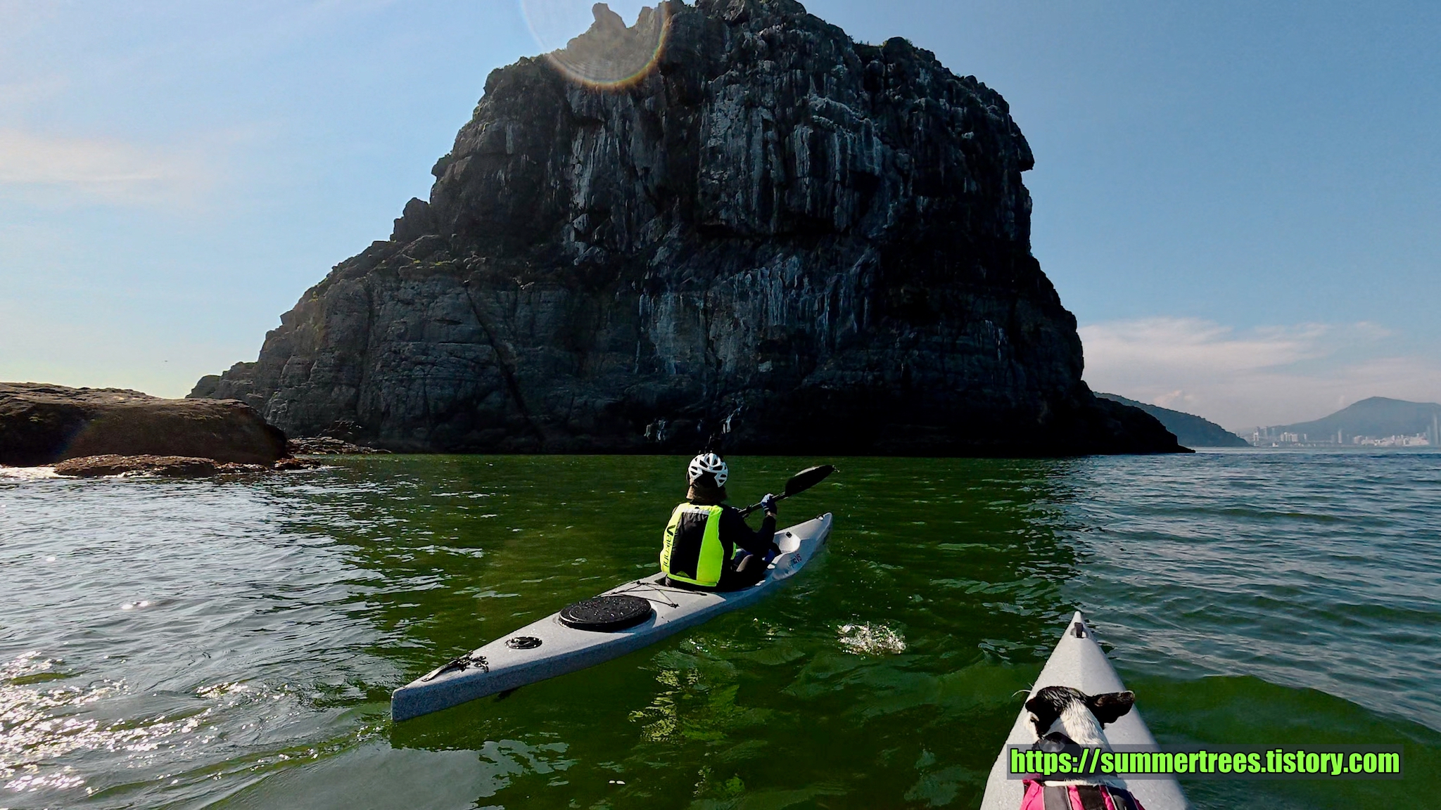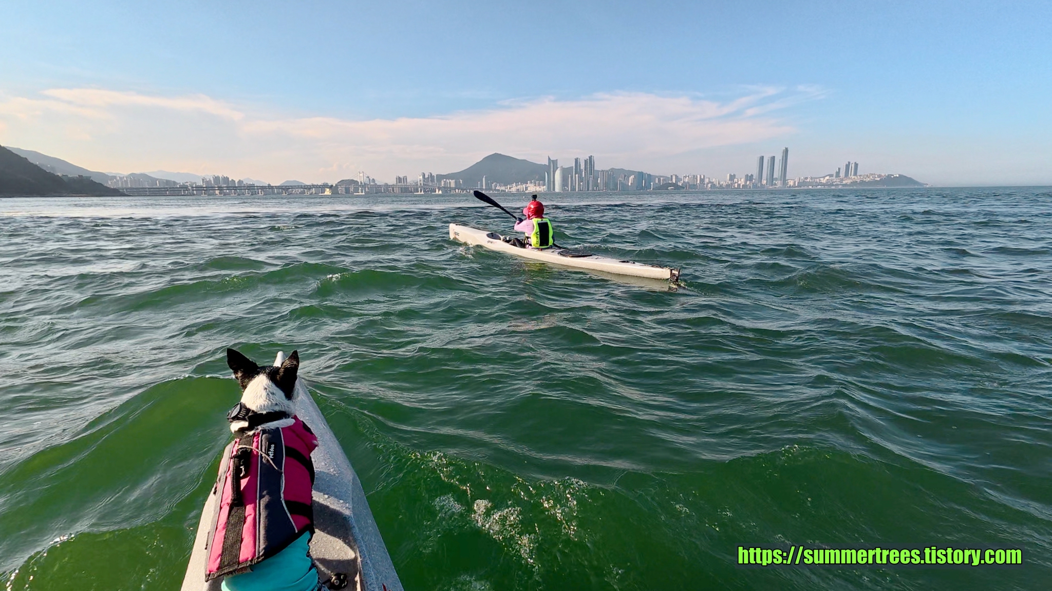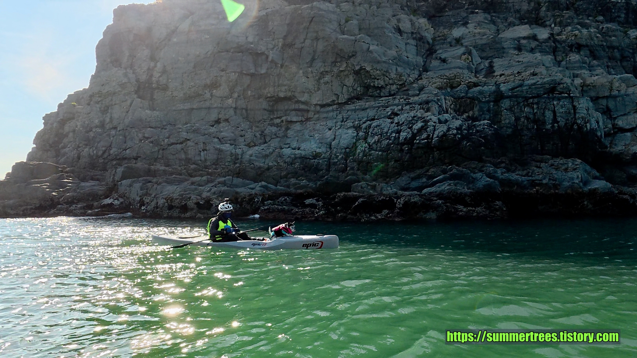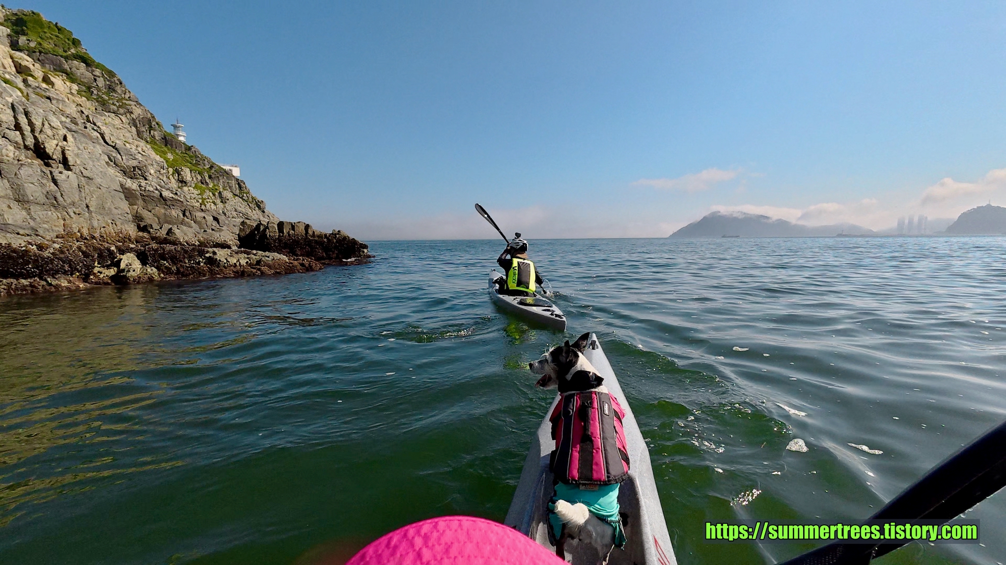 송곳섬과 수리섬 사이에 빠른 조류대가 있다. 초보 시절엔 바짝 겁먹었던 조류다. 이제 신나게 탄다.