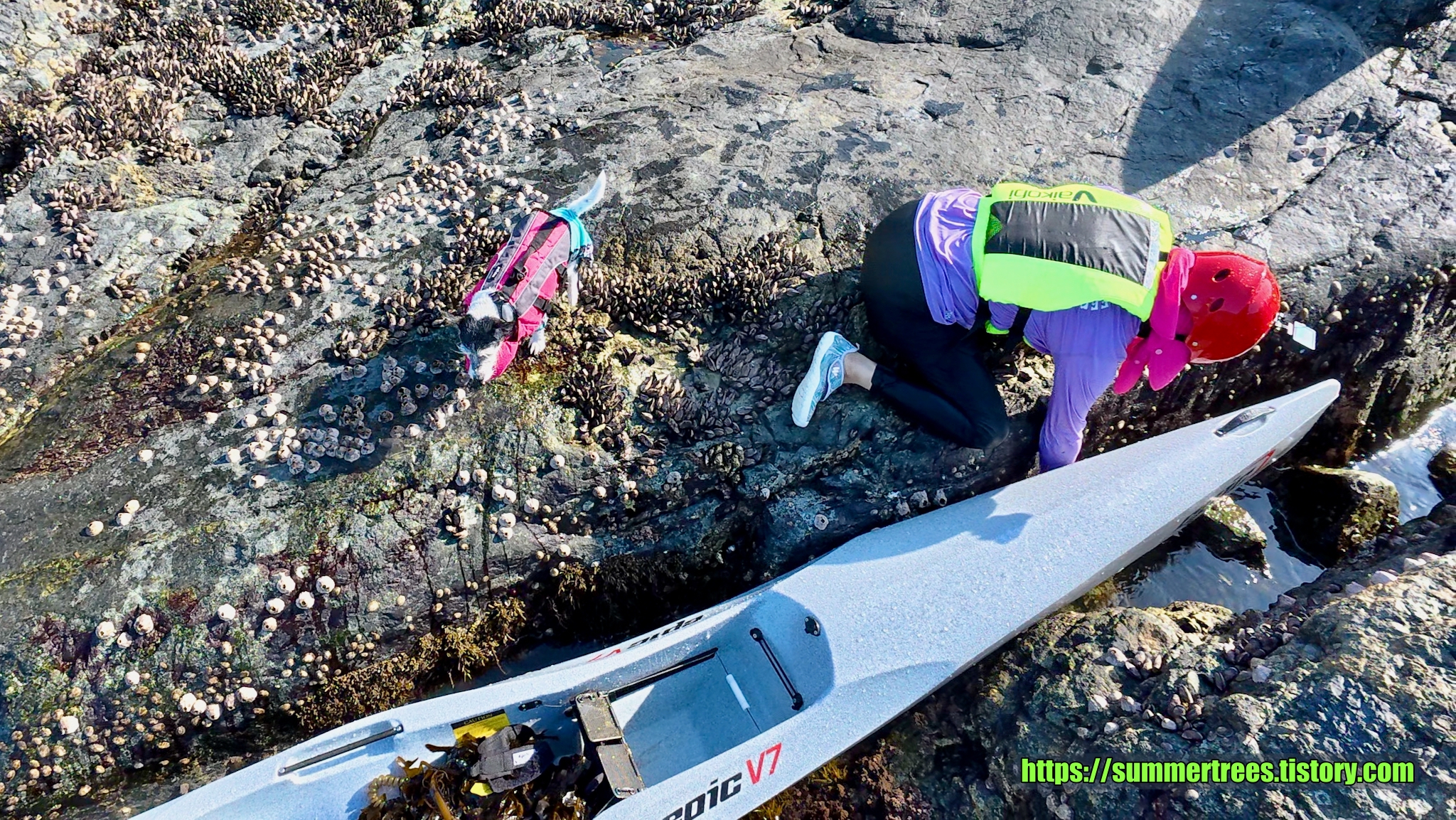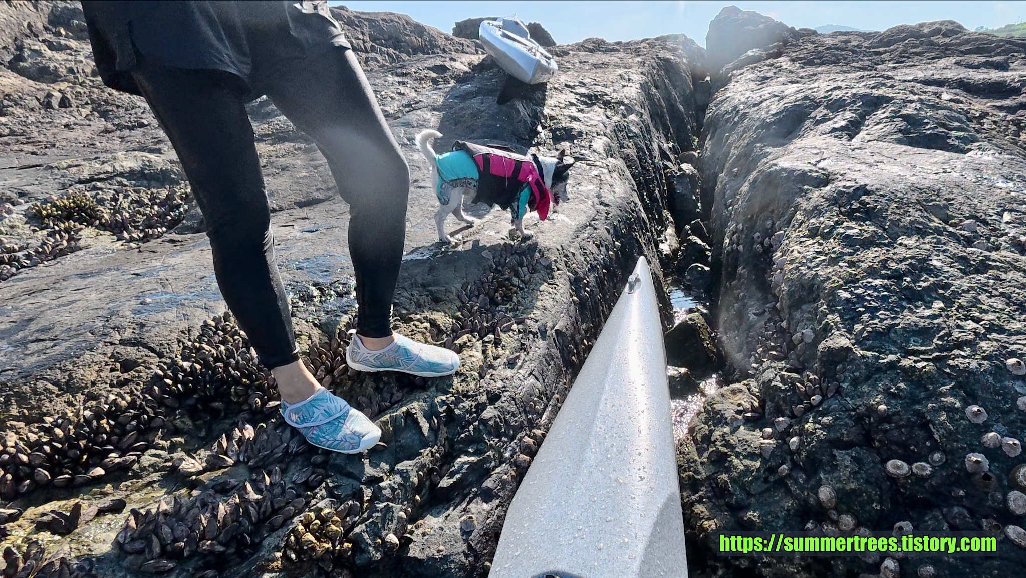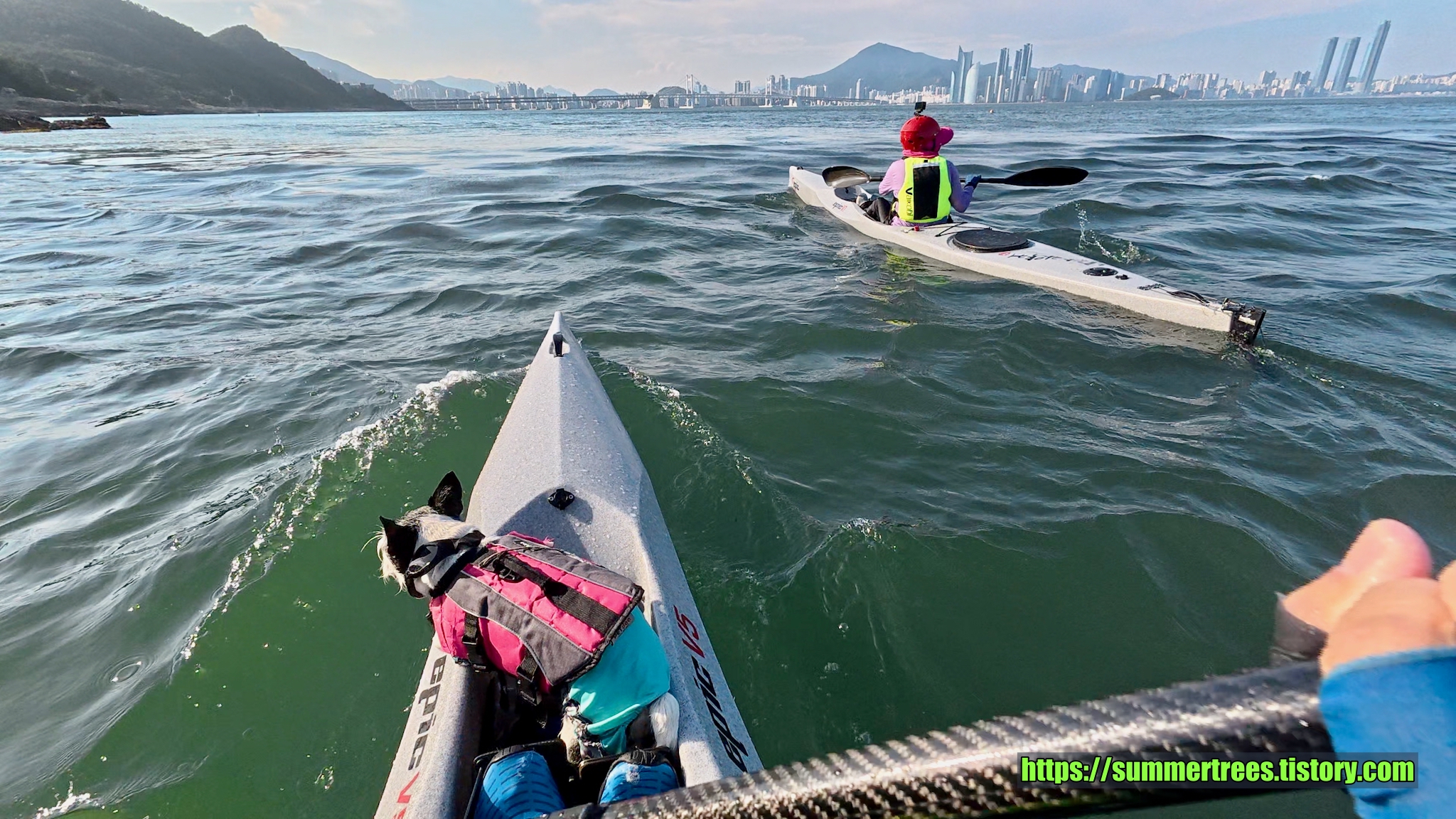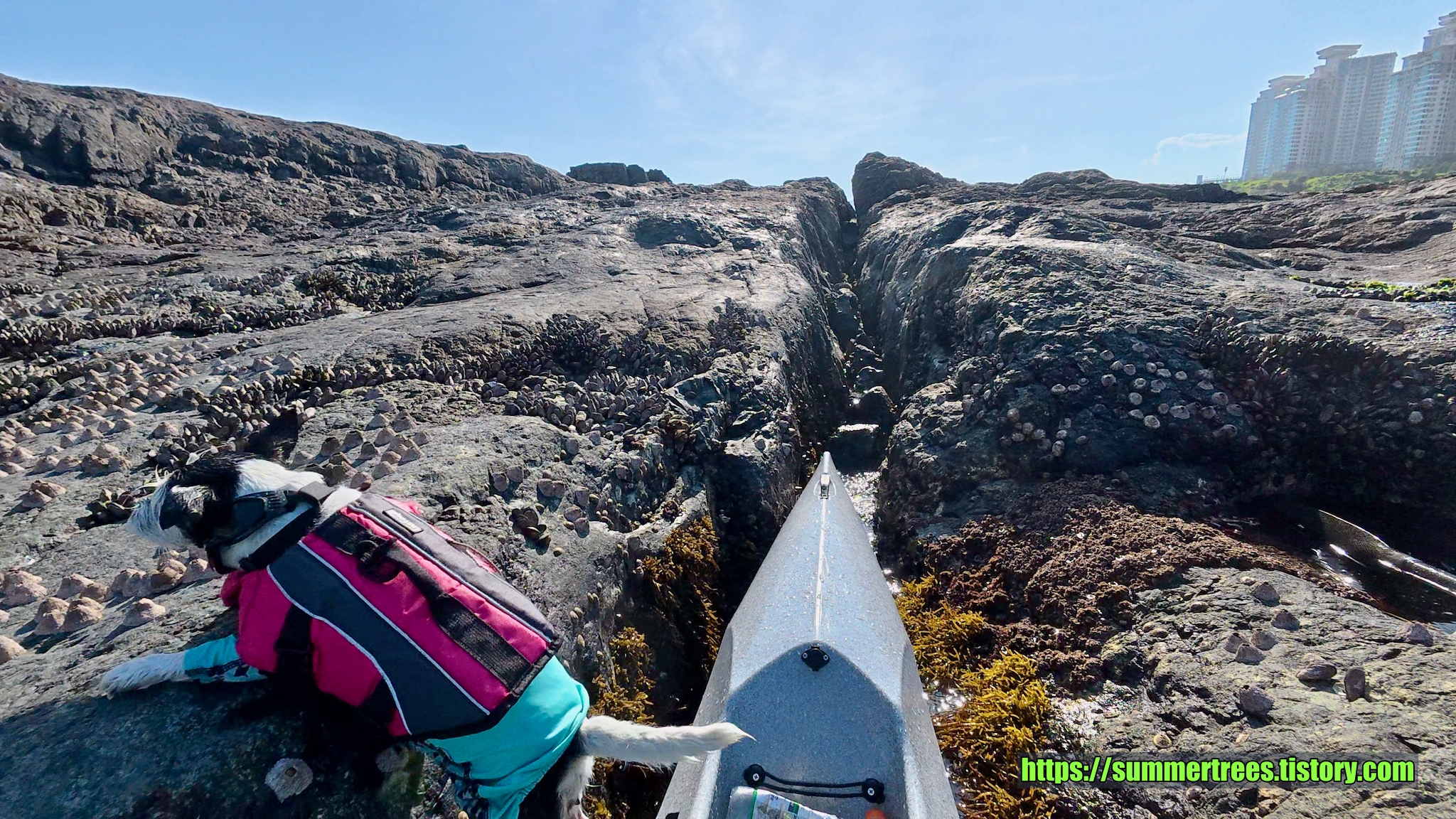 송곳섬과 수리섬 사이에 빠른 조류대가 있다. 초보 시절엔 바짝 겁먹었던 조류다. 이제 신나게 탄다.