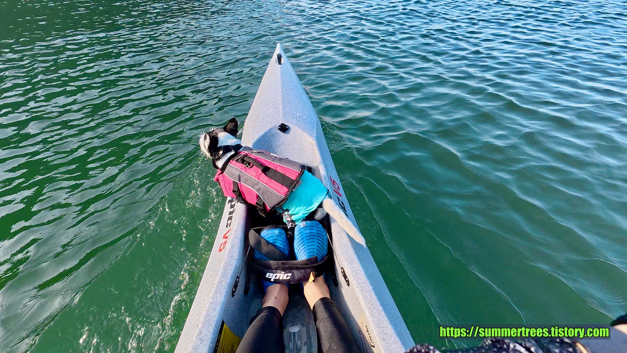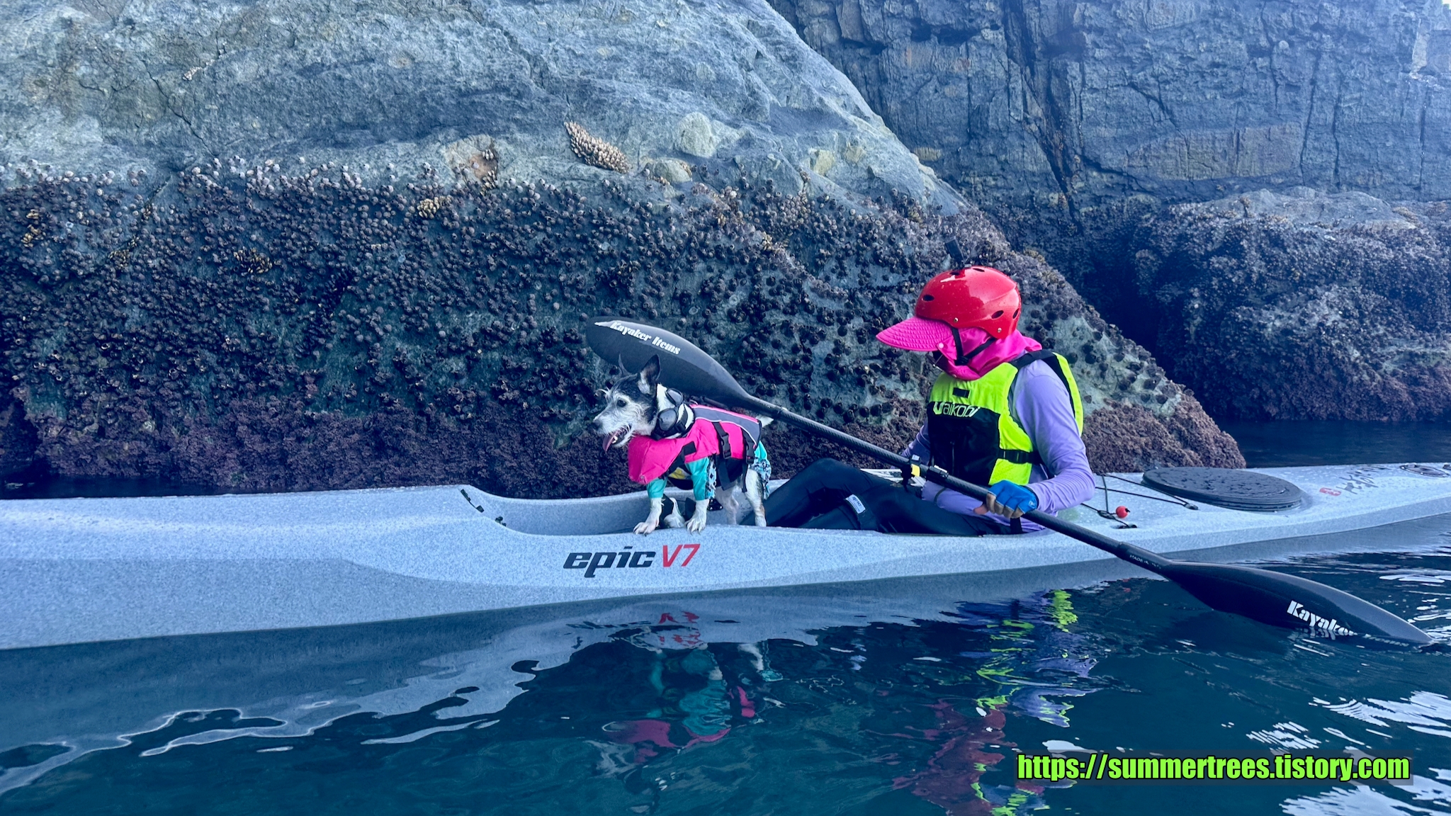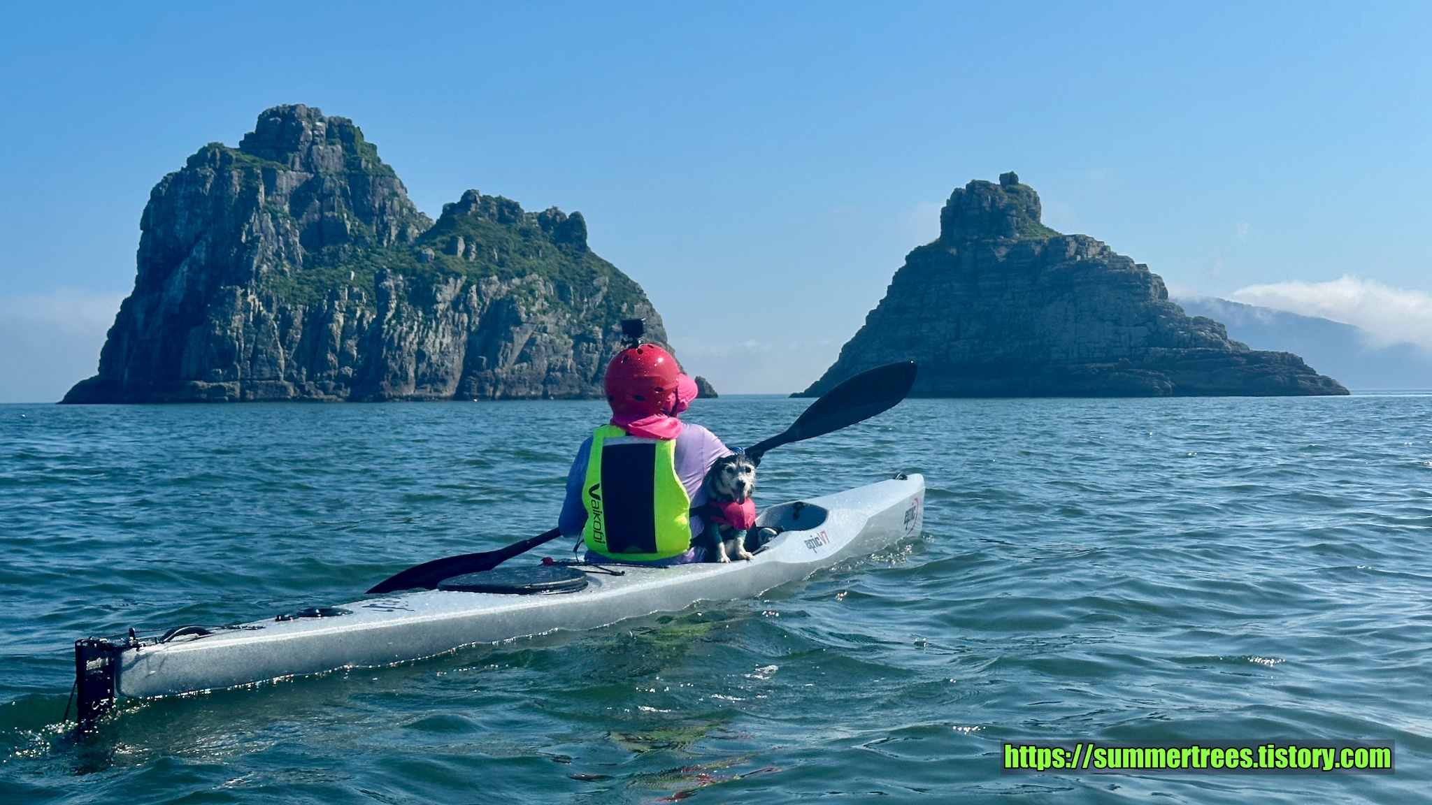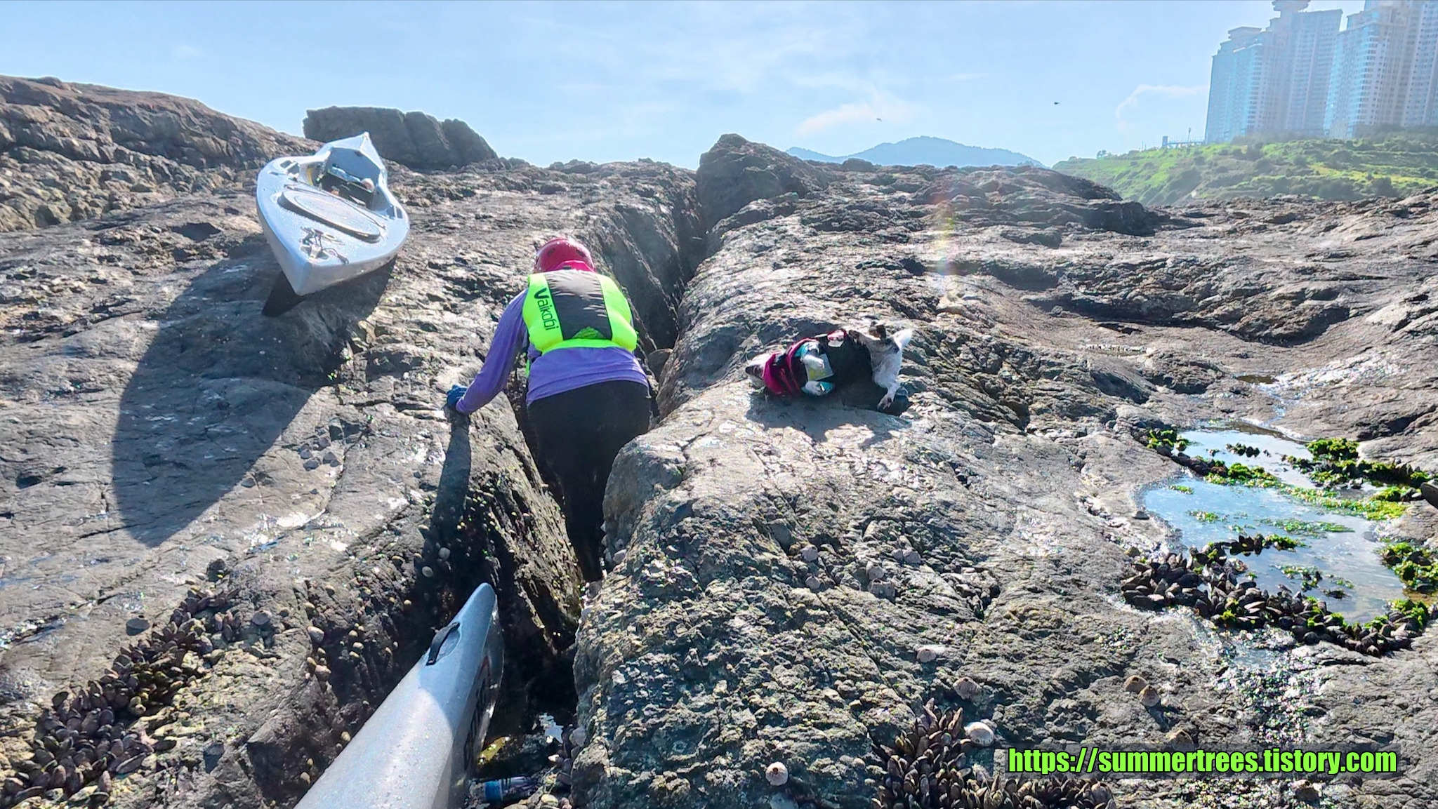 송곳섬과 수리섬 사이에 빠른 조류대가 있다. 초보 시절엔 바짝 겁먹었던 조류다. 이제 신나게 탄다.