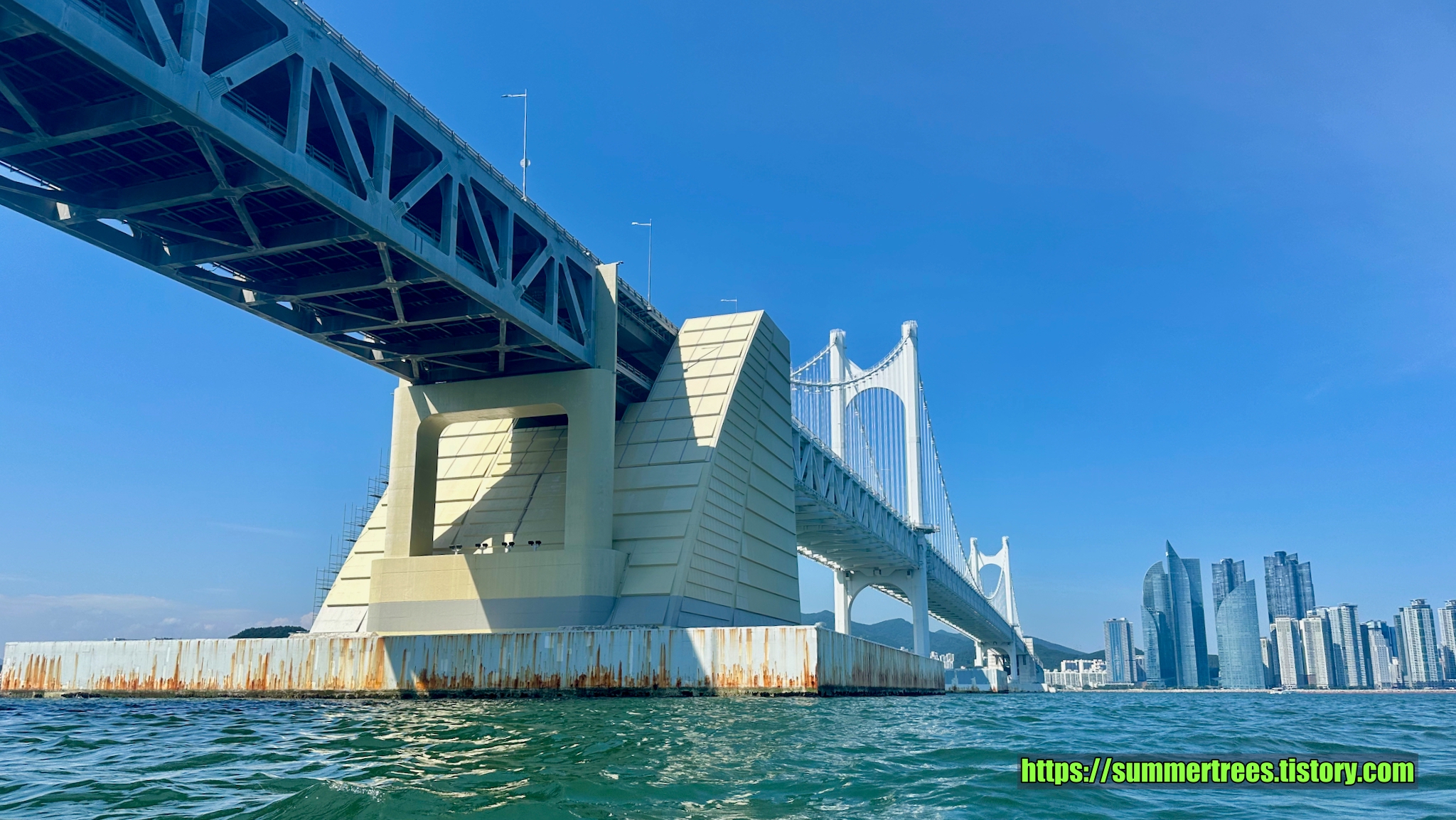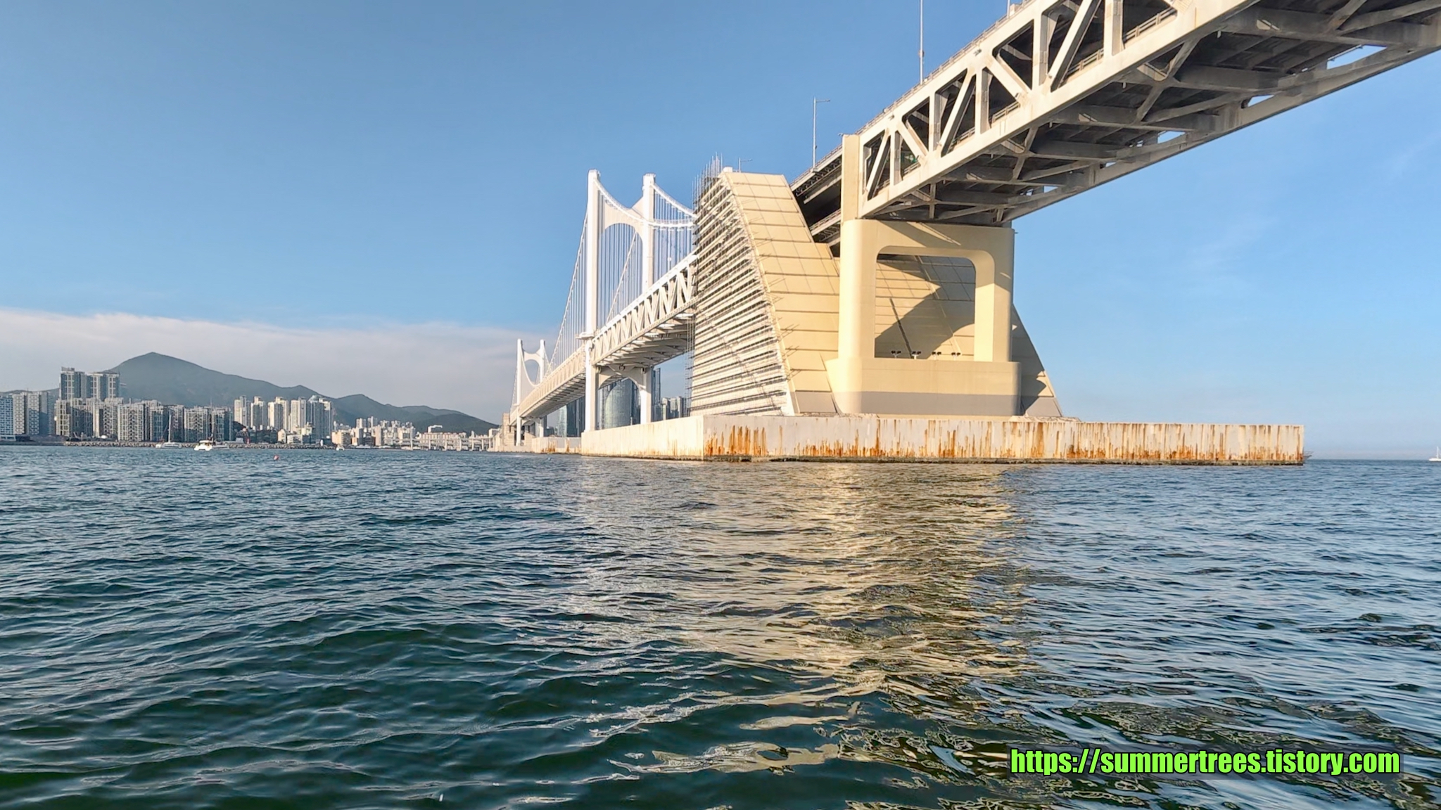 대교를 지나 대교의 그늘 아래에서 잠깐 휴식. 아무리 뜨거운 날이라도 바다에 나오면 물 위에서는 시원하다.