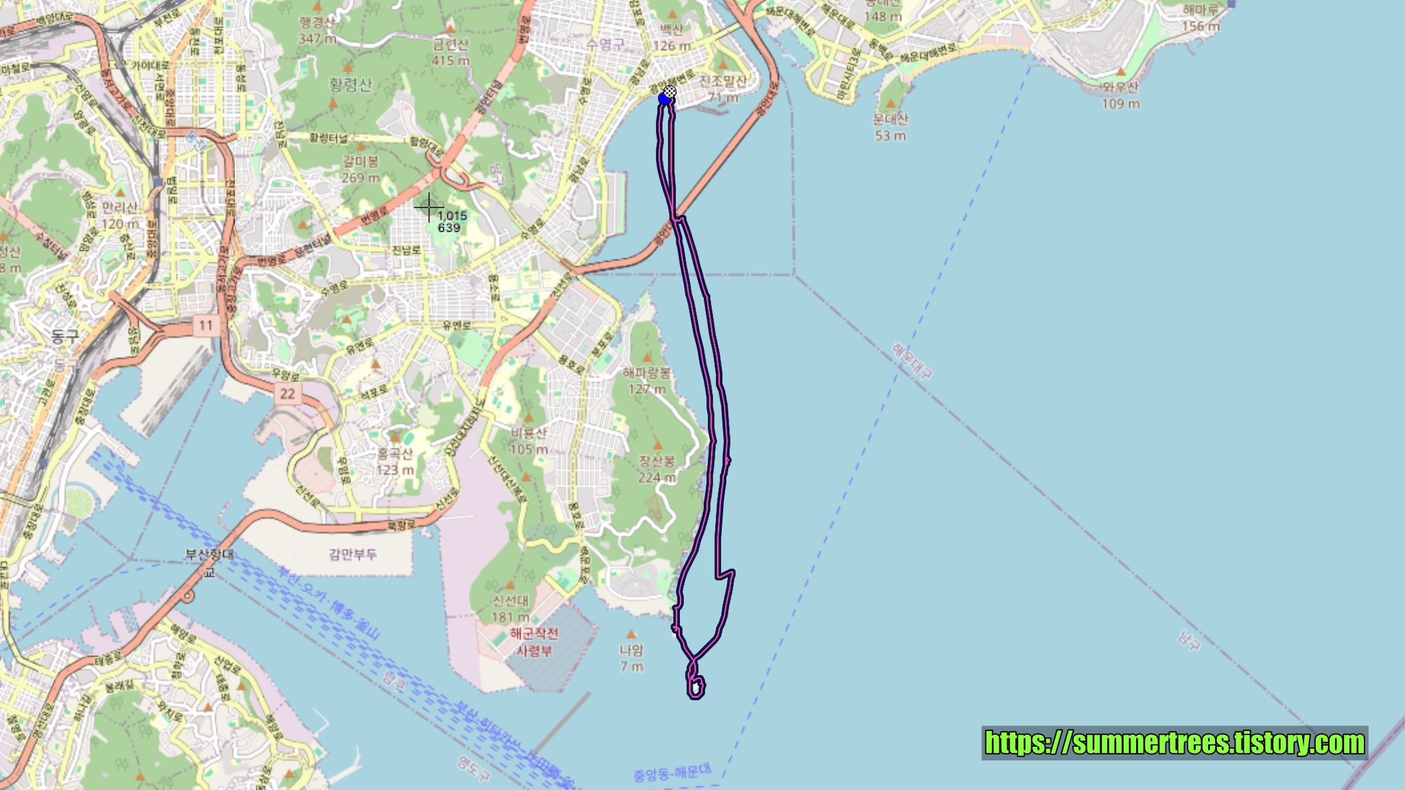 출발 / 광안대교 / 휴식 / 패들링 / 파도 / 제트스키 / 휴식 / 유람선 / 오륙도 / 수리섬 / 송곳섬과 굴섬 / 등대섬 / 마야 입수 / 굴섬 남안 / 굴섬의 굴 / 미역 따기 / 송곳섬 남안 / 송곳섬과 수리섬 사이 조류 / 송곳섬 북안 / 수리섬 / 솔섬 / 솔섬과 방패섬 / 솔섬과 방패섬 통과 / 방패섬 휴식 / 마야 / 오륙도스카이워크 / 이기대 바위들 / 패들링 / 광안대교 복귀 / 요트 / 복귀 / 마무리 / 광안리 / 저녁 / 미역 / 발부상