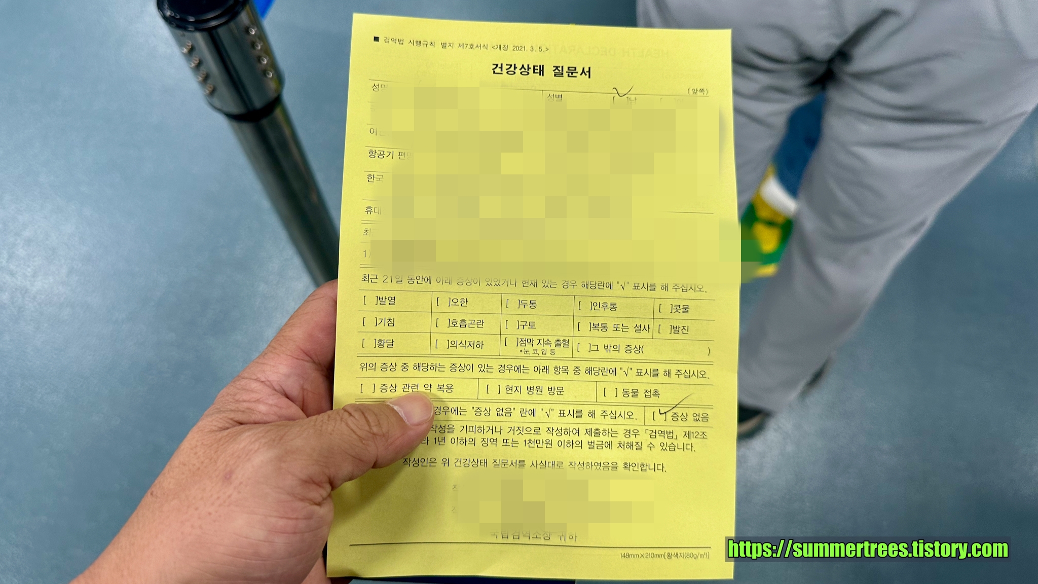 베트남에 코로나가 다시 번져 건강상태 질문서를 작성해야 했다.