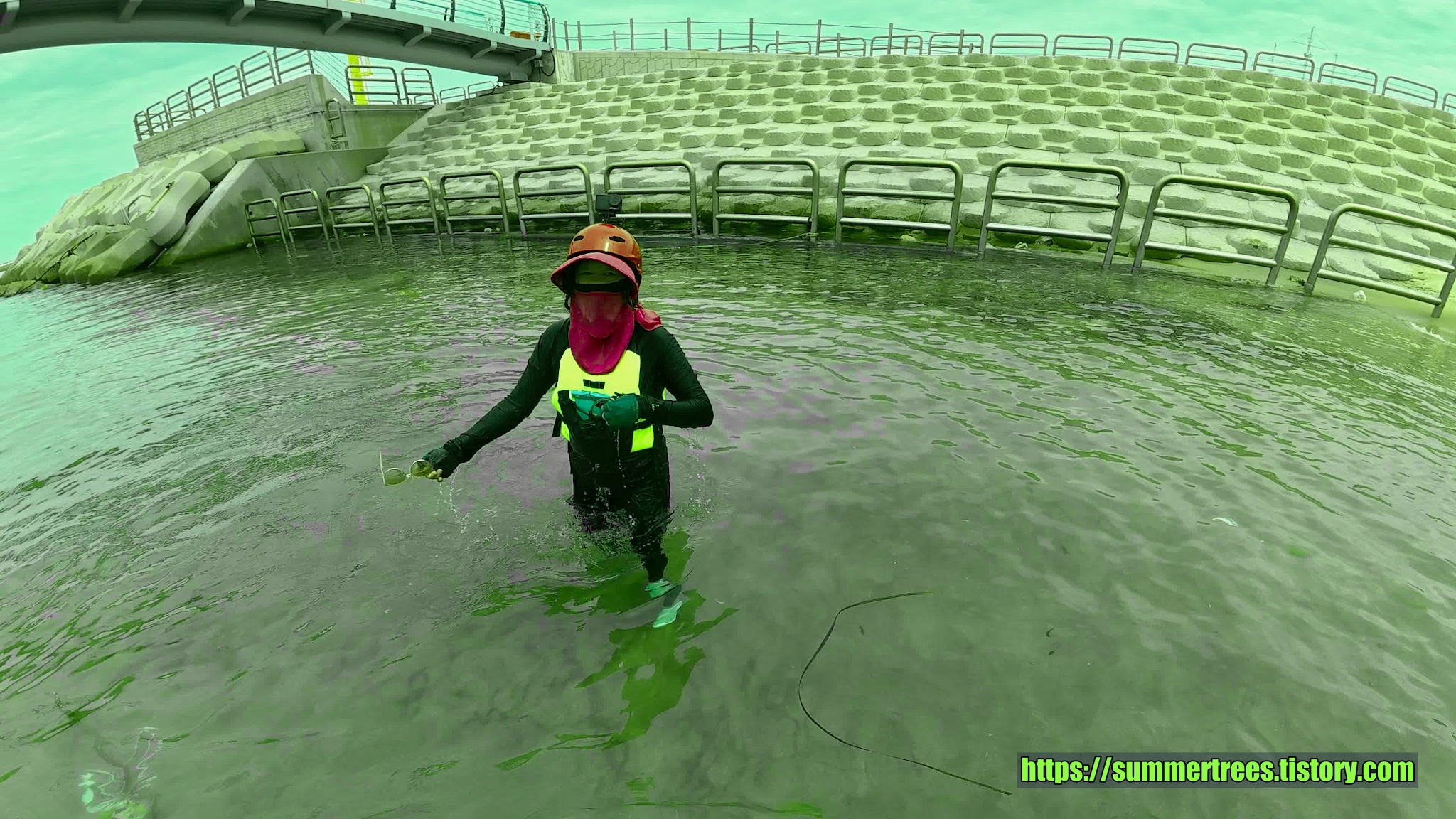 물 위를 떠다니는 소주병을 주웠다.