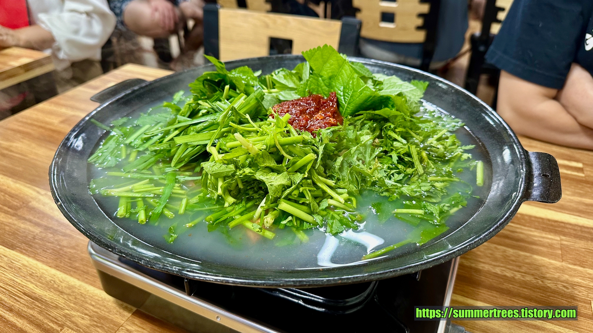 처음엔 닭 대신 야채부터 먹는다. 야채부터 먹기 시작해서 야채를 다 먹어갈 무렵부터 익은 닭을 먹는다. 무슨 야채인지는 잘 모르겠는데, 약간 쓴 맛이 났다.