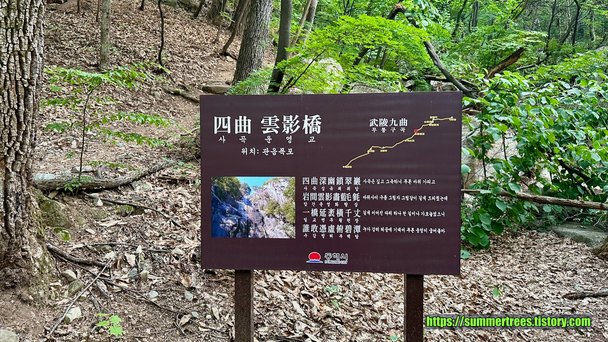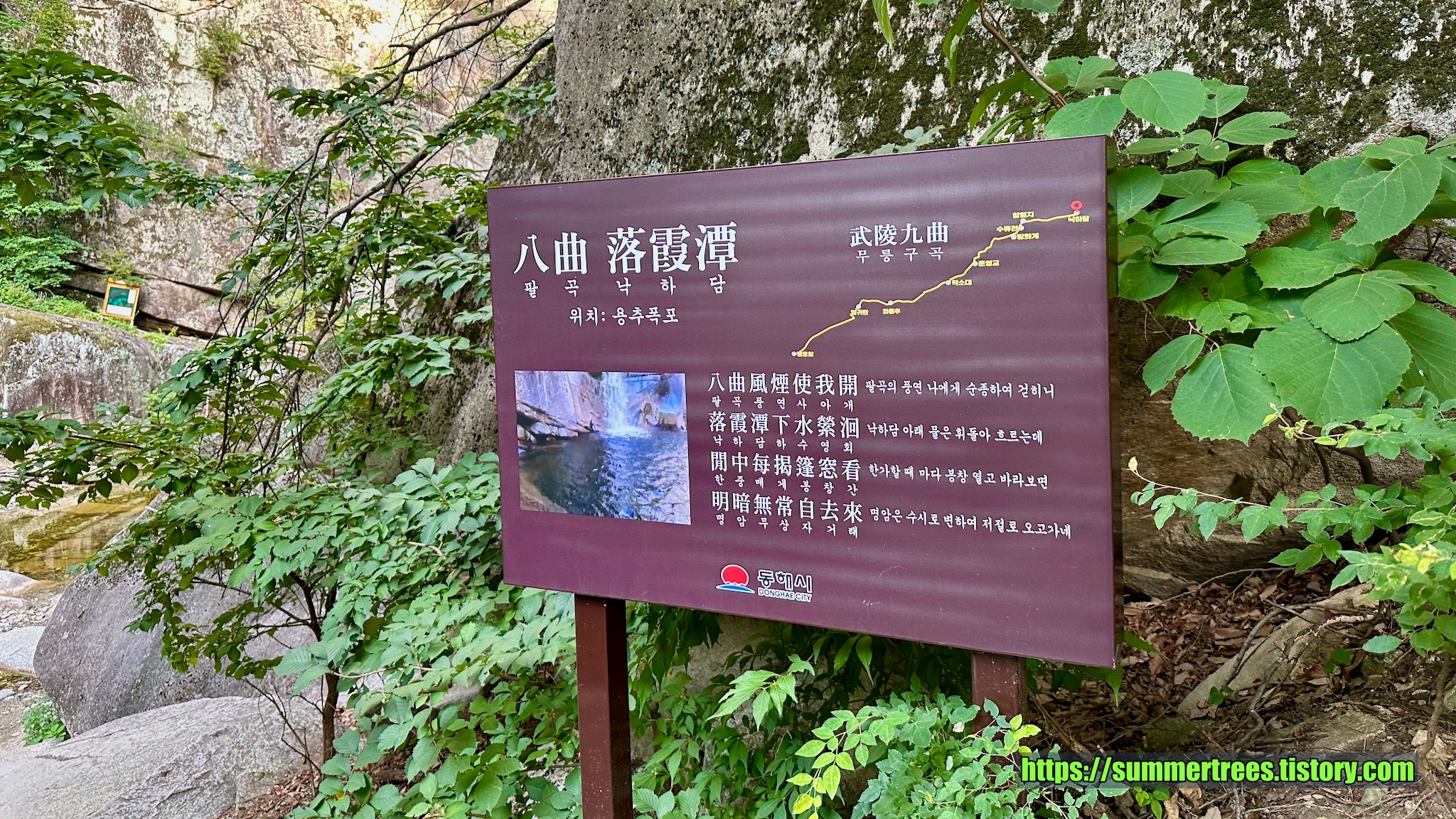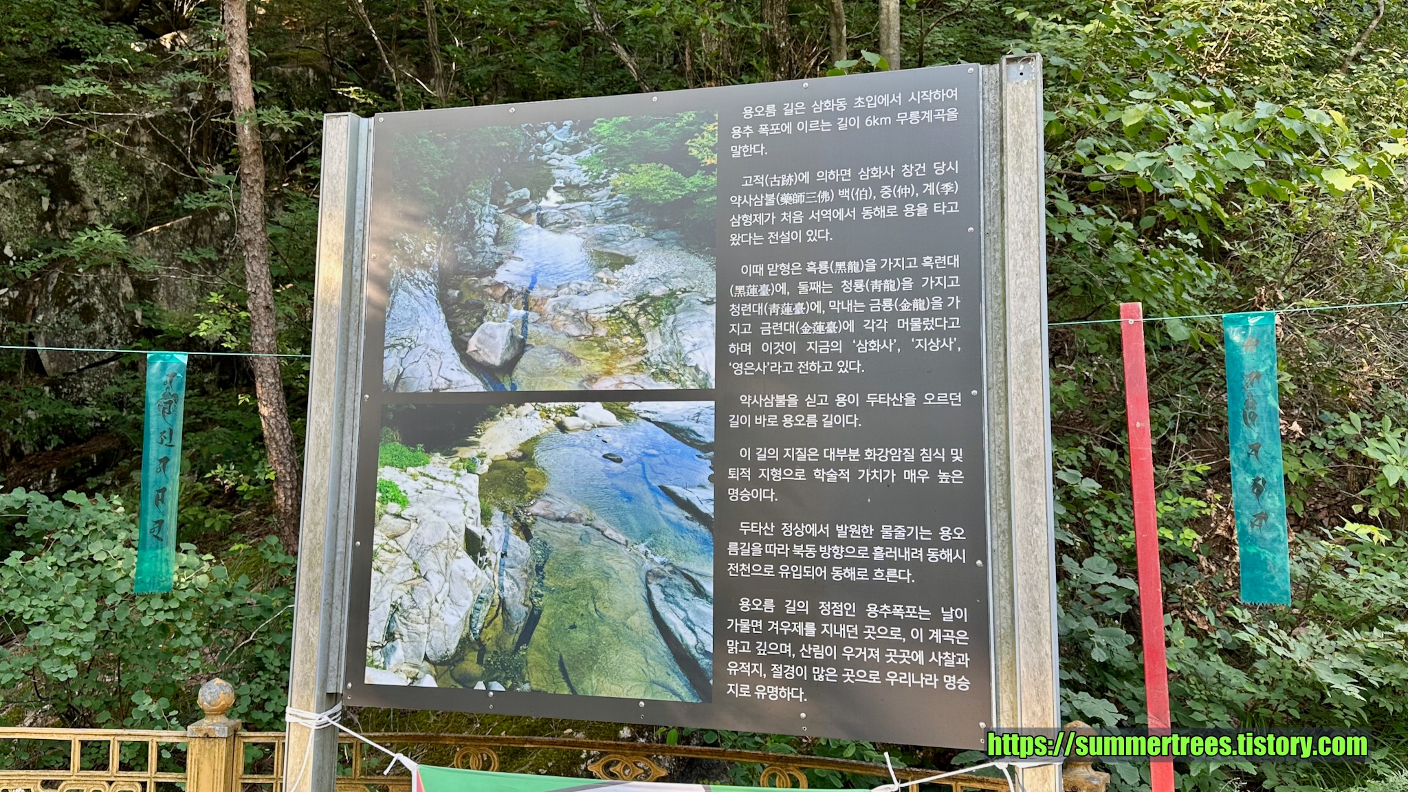 두타산 용추폭포는 입구에서 3 km 거리다. 짧은 코스라서 1 시간이면 갈 수 있다. 우리는 아침 6시에 숙소를 나와 입장료를 내지 않고 다녀올 수 있었다.
