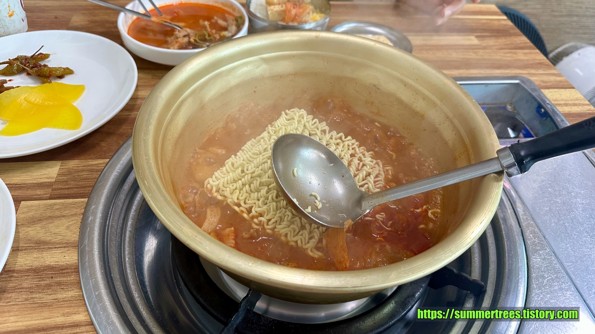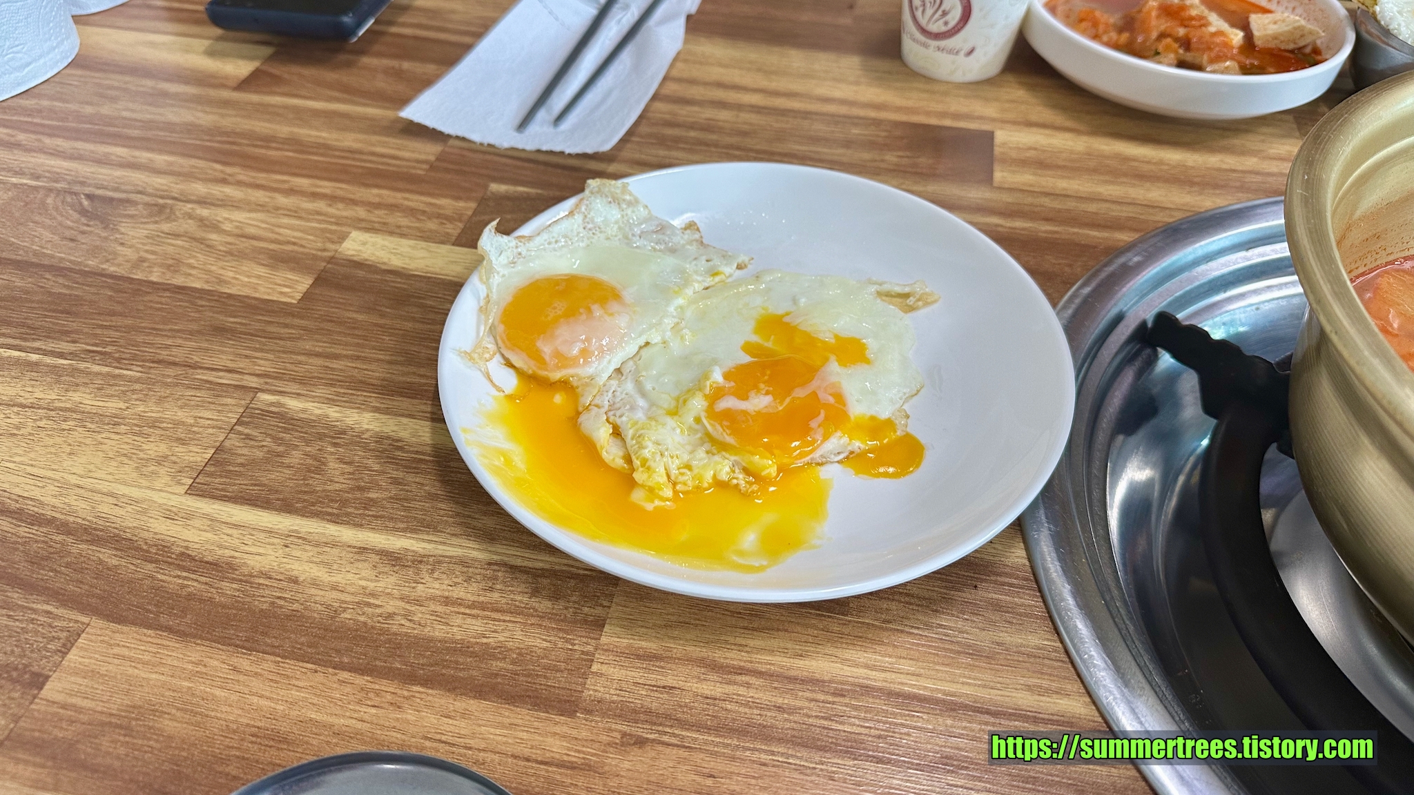 찌개와 함께 라면사리가 필수인 듯하고, 특이하게도 달걀을 인당 두 개까지 먹을 수 있다.