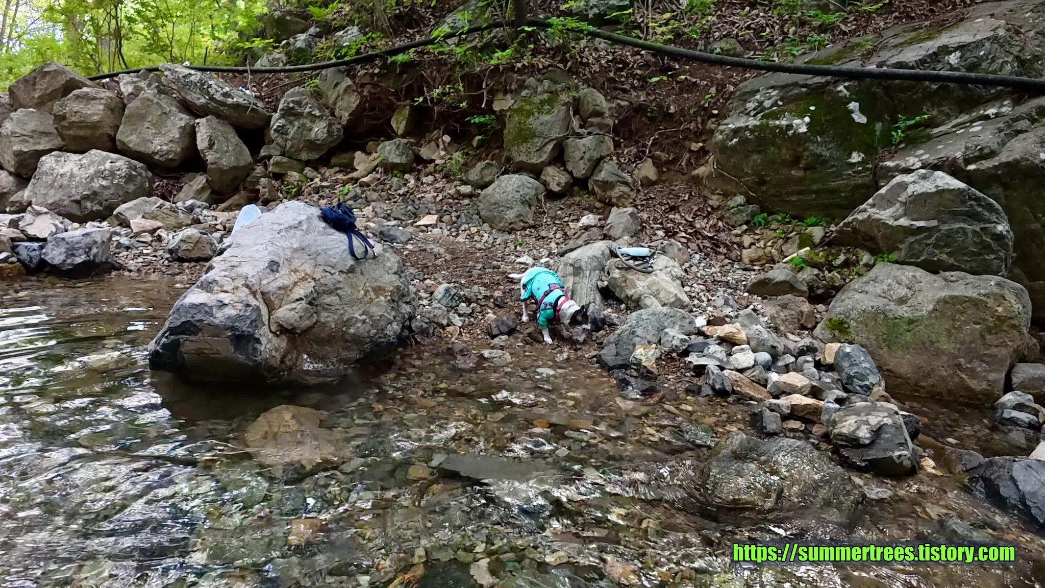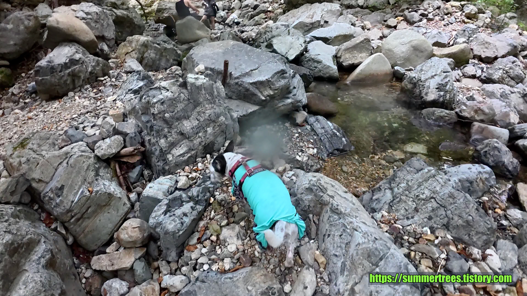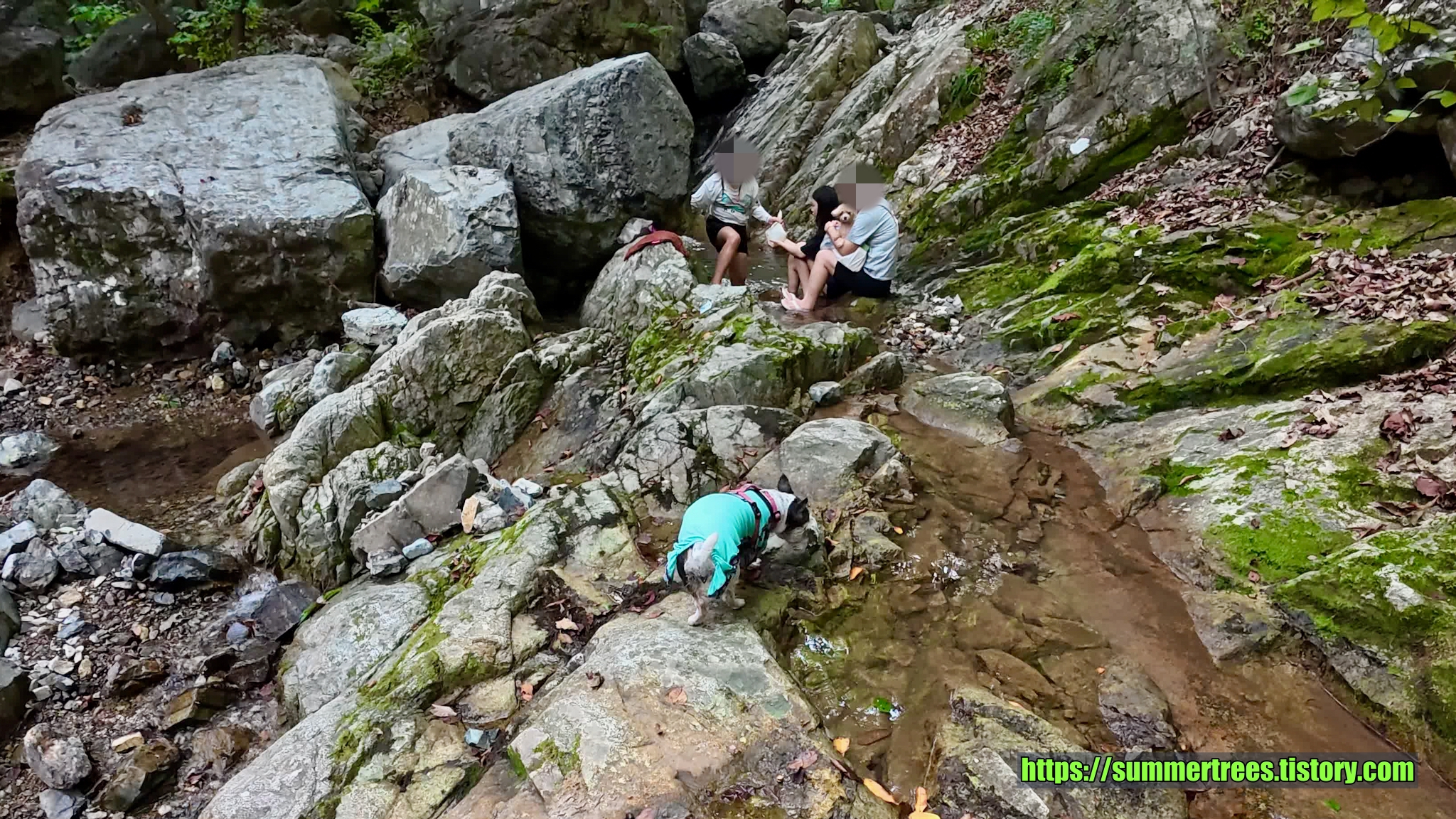 계곡물이 차 마야가 떨어서 래시가드를 입혀줬다.