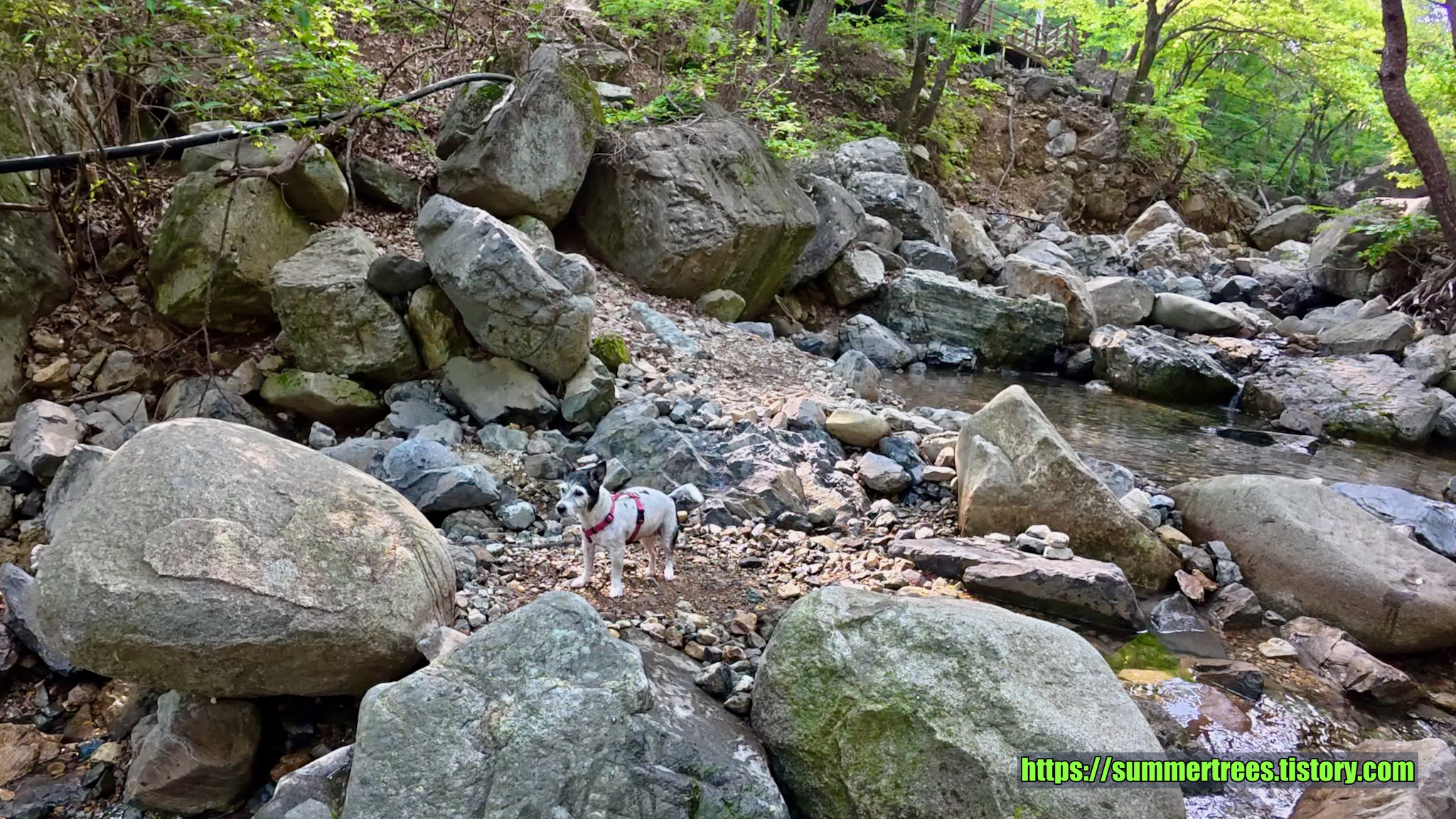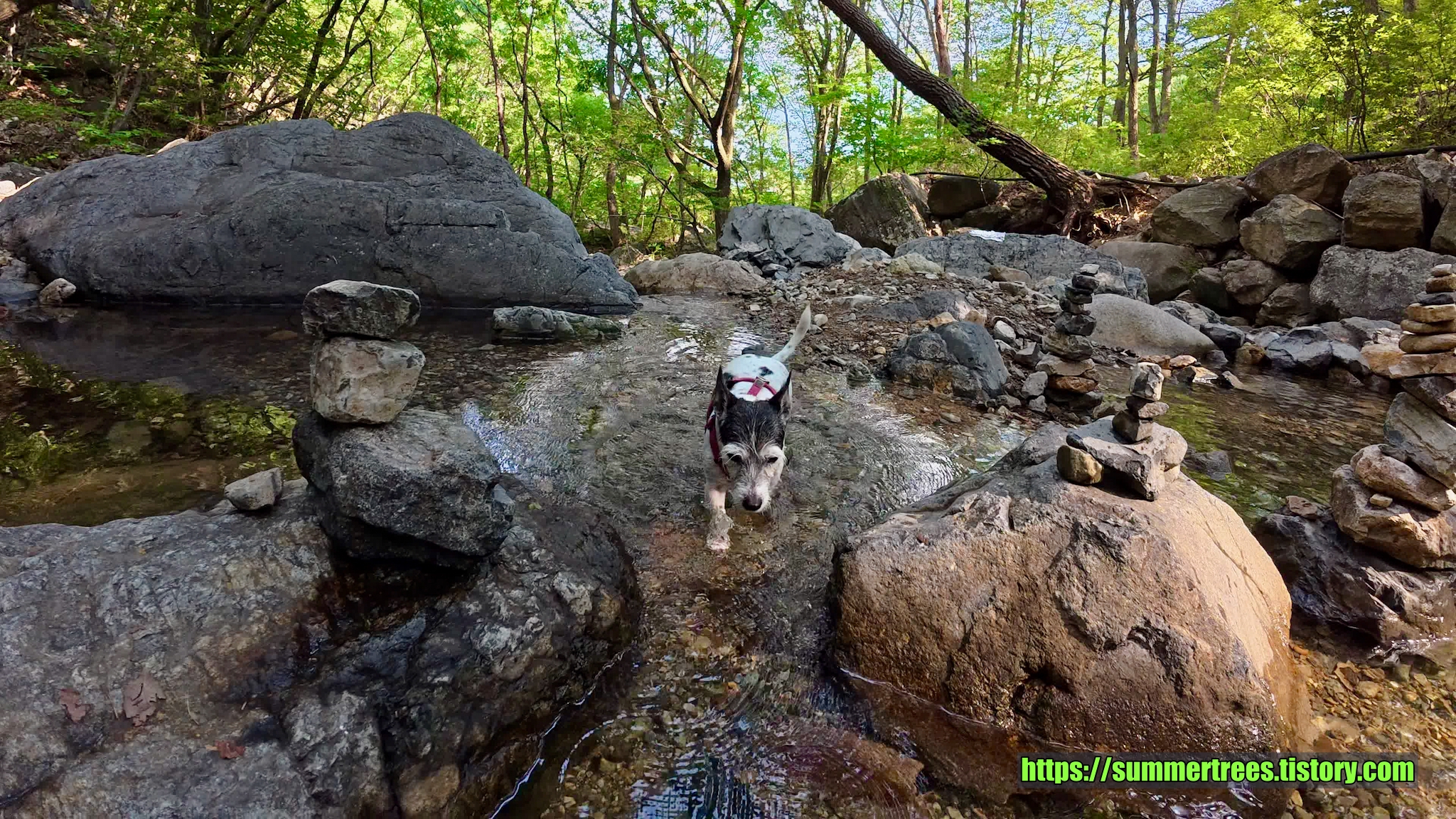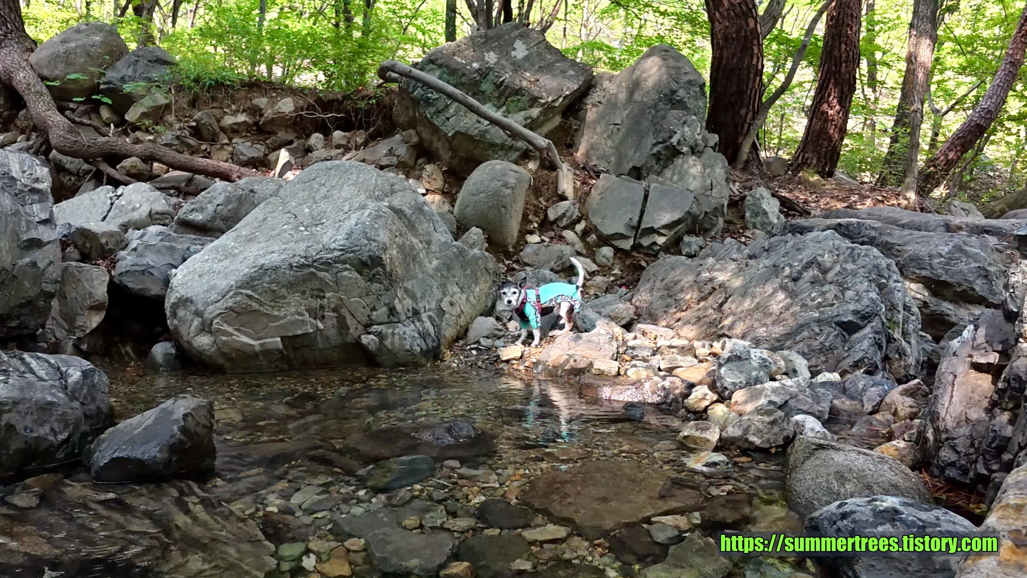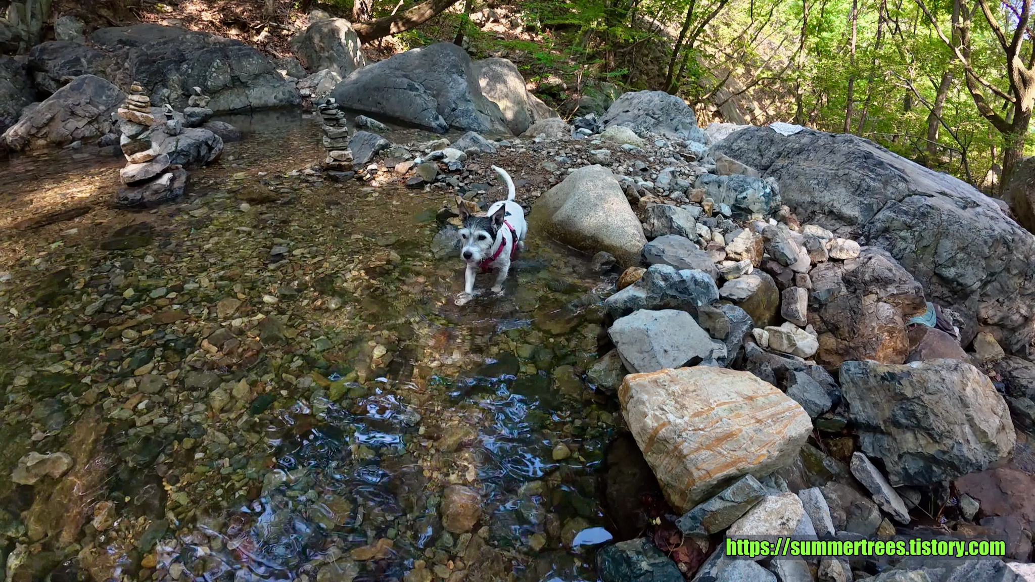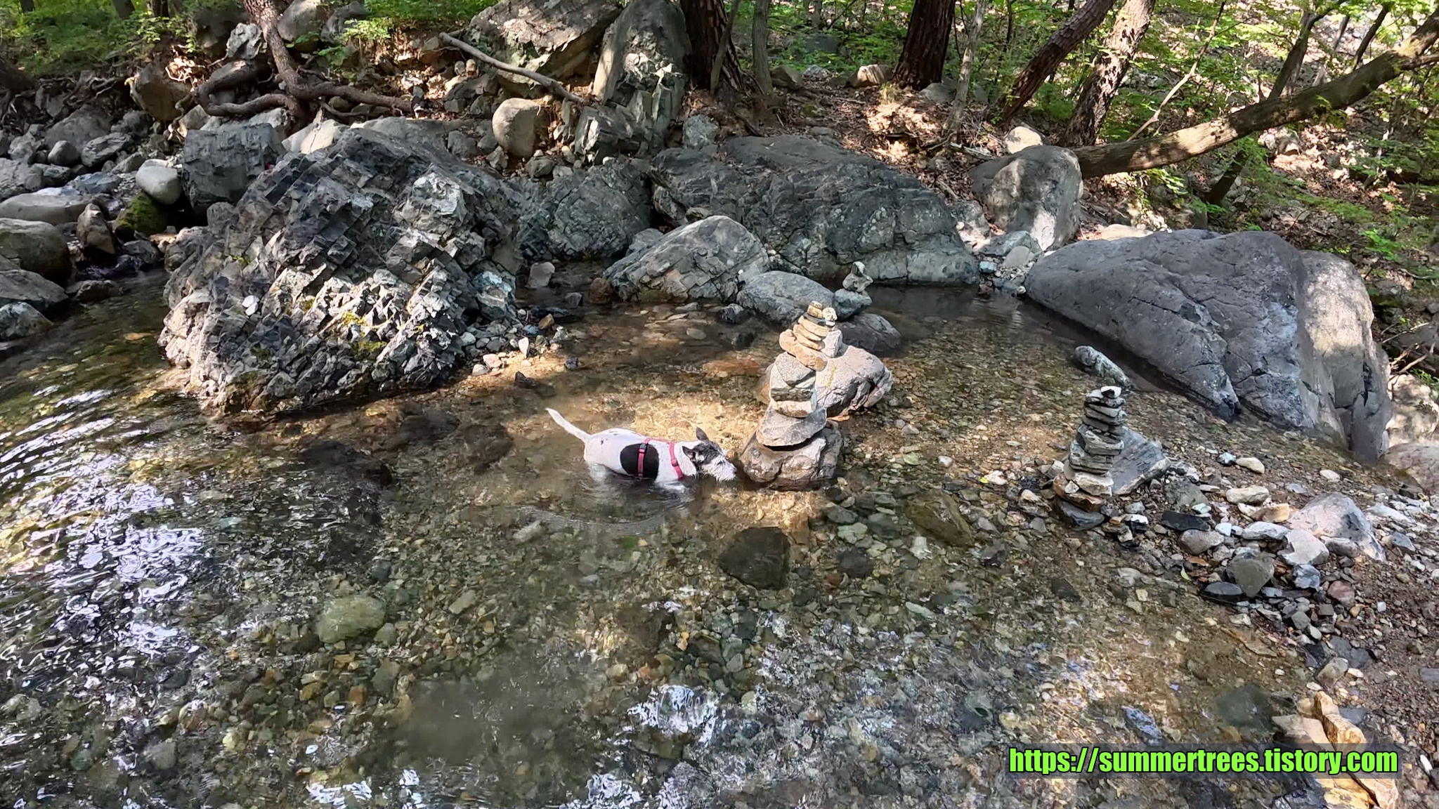 한솥도시락을 먹고 싶었는데 일요일은 오후 2시까지만 영업을 하는 바람에 고봉민김밥에서 김밥을 싸왔다. 우리가 김밥을 먹는 동안 마야는 계곡탐험에 정신이 없다.